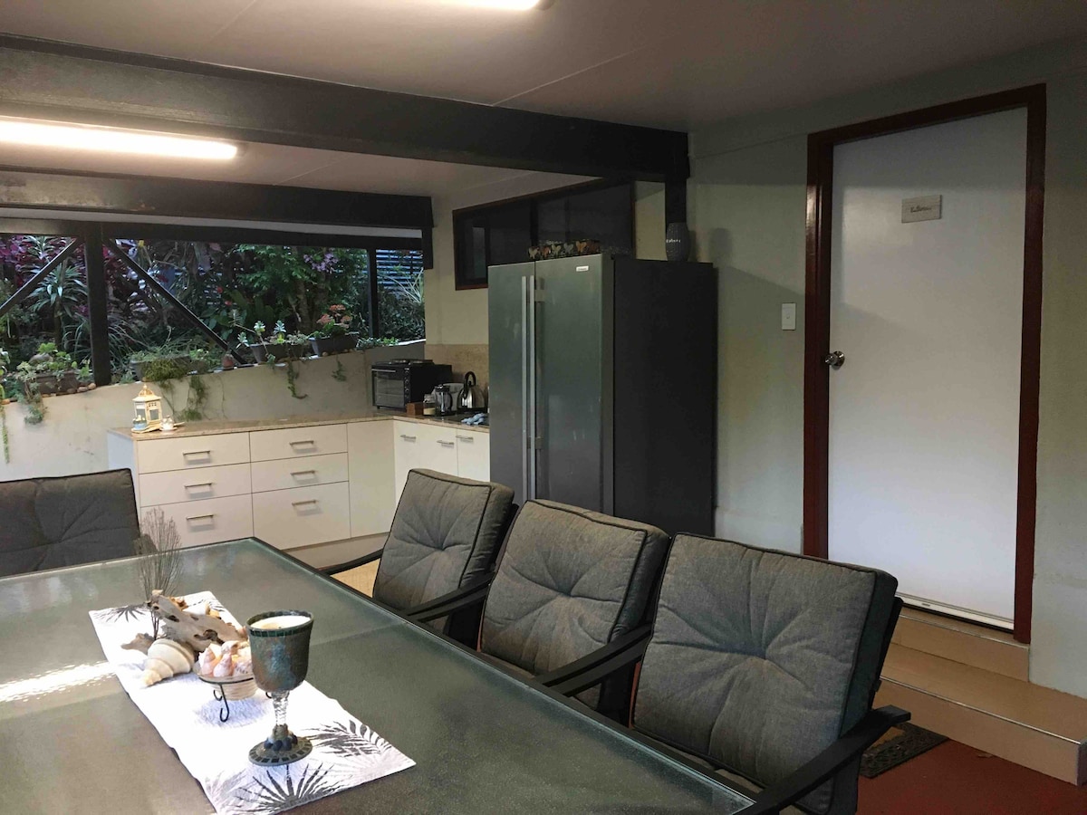 Apartamento en planta baja, los propietarios viven arriba. Un perro amistoso reside en la propiedad. 2 dormitorios. 1 cama tamaño queen, 1 cama doble. Patio, barbacoa y zona de piscina para los huéspedes. Exuberante entorno tropical, árboles que dan sombra, piscina de magnesio. Cerca de senderos para caminar por el monte, paradas de autobús, a 3-5 minutos a pie de la playa y de las tiendas. A 8 minutos a pie de la terminal de transbordadores. Muy cerca de todos los servicios, pero rodeado de árboles, pájaros, ualabíes y koalas. Con el arroyo al otro lado de la carretera, te sentirás como si estuvieras en una selva tropical.
