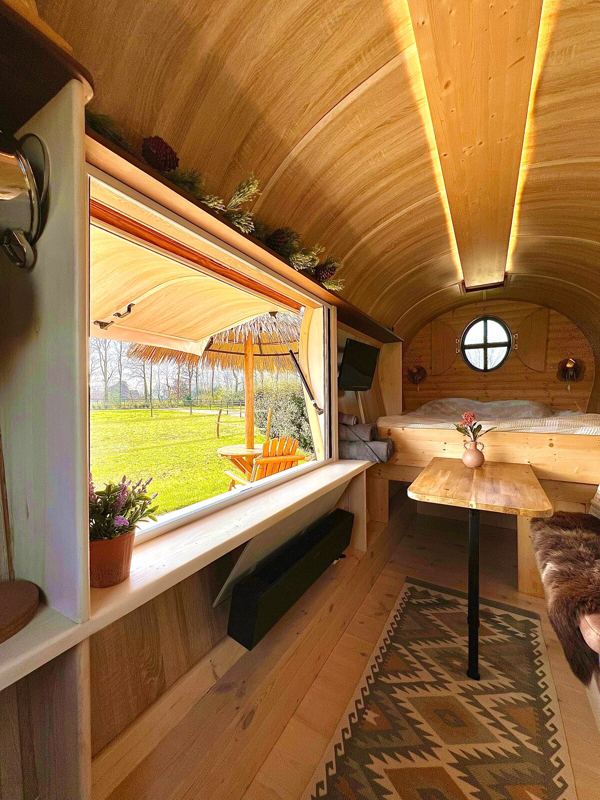 Volop genieten van de rust en de natuur doe je in mijn B&B. Deze met zorg ingerichte pipowagen staat aan de bosrand, achterin ons weiland. Je hebt hier volledige privacy en bent helemaal alleen. Je kunt heerlijk buiten douchen. Omringd door de natuur vergeet je de drukte van de dag en kom je helemaal tot jezelf. De zonnepanelen op het dak voorzien de wagen van stroom, met het off-the-grid toilet heb je alle nodige voorzieningen binnen handbereik. In de buitenkeuken kun je een maaltijd bereiden.