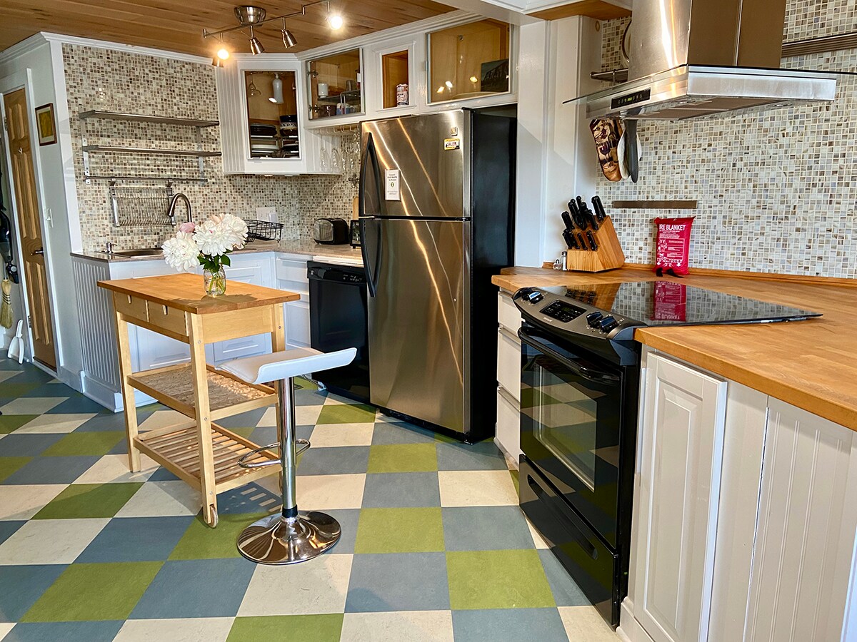 Una unidad de un solo piso con detalles únicos en una casa de 2 unidades que cuenta con una gran cocina/comedor, sala de estar y una acogedora terraza privada. Dormitorio tamaño queen y capacidad adicional para 2 personas con un colchón de aire de lujo. Este espacio es perfecto para parejas, familias con niños pequeños o una sola persona. Solo se permite un perro, no se admiten gatos. Esta unidad está en la planta baja de una casa de dos familias, ocasionalmente se pueden escuchar pasos desde arriba. Ten en cuenta que el aparcamiento en el sitio es muy estrecho, solo para coches pequeños y SUV compactos.