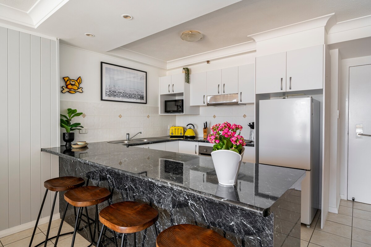 ¡Este apartamento de dos dormitorios recién renovado es único en la emblemática torre Q1! Disfruta de una cama tamaño queen en el dormitorio principal y una cama tamaño king o dos camas individuales en el segundo dormitorio, dependiendo de la reservación. La moderna cocina y el balcón cerrado son perfectos para familias, parejas o viajeros de negocios. Disfruta de las instalaciones del centro vacacional y de un lugar para autos dedicado justo en el corazón de Surfers Paradise.