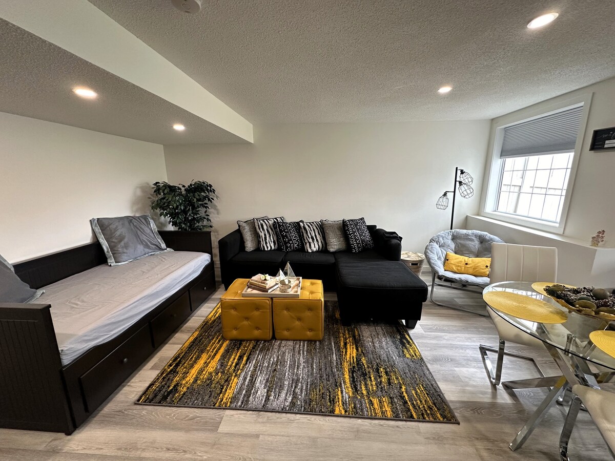 ¡Te damos la bienvenida a tu hogar lejos de casa! Esta elegante y cómoda suite es perfecta para profesionales que buscan un espacio moderno a minutos del centro de la ciudad. Convenientemente ubicado a solo 10 km del aeropuerto y a 5 km del centro de la ciudad. Encontrarás una parada de autobús a solo unas manzanas de distancia, junto con una cafetería, Dairy Queen, una tienda de vinos y una pizzería, todo a poca distancia. Para los amantes del aire libre, el Confederation Park está a solo 1,5 km. Nota: Los huéspedes deben tener 5★ reseñas anteriores ¡✨ Descuentos para estancias de 2 noches o más!