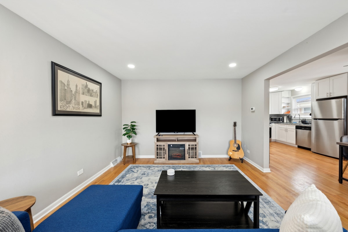 Relájate con toda la familia o explora la ciudad en este tranquilo apartamento recién renovado de 3 dormitorios y 1 baño con mucho aparcamiento gratuito y lavadora/secadora en el alojamiento. Estarás cerca de todo si te hospedas en este alojamiento céntrico. ¡A solo 2 minutos de DT Evanston y a 25 minutos de DT Chicago! A pocos minutos de las universidades Northwestern y Loyola. Disfruta de los televisores inteligentes de 65 y 55 pulgadas, escucha tus canciones favoritas con el altavoz Amazon Echo Alexa con voz o disfruta de juegos familiares.