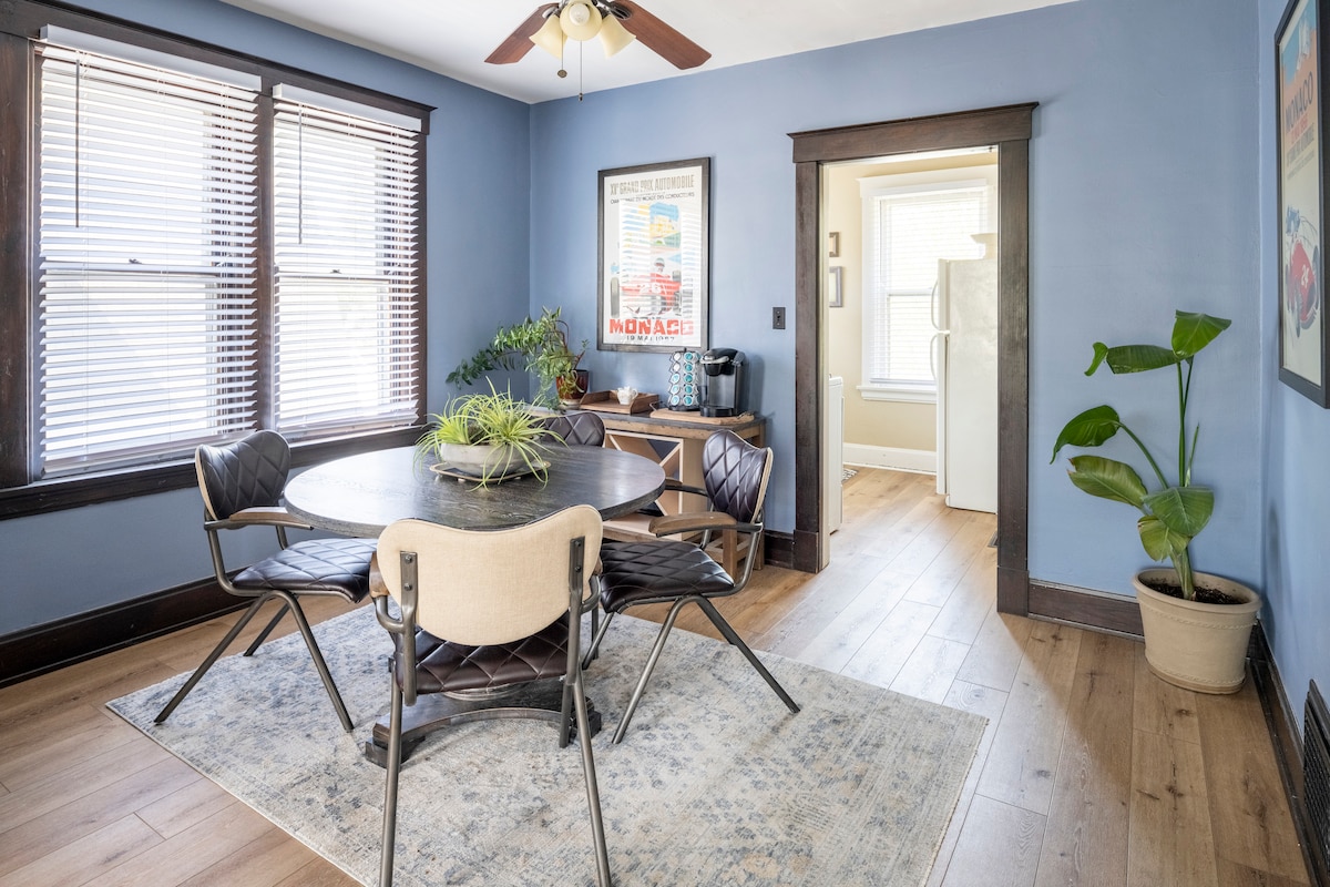 Amplio, espacioso y elegante, este apartamento de 850 pies cuadrados en el segundo piso tiene capacidad para más de 4 huéspedes. Ubicado en un barrio tranquilo y transitable cerca de los mejores restaurantes, tiendas y cervecerías. Oakley/Hyde Park es una zona vibrante cerca de UC, Xavier y Mayfield Clinic. Dormitorio 1: cama tamaño queen, armarios vacíos, ropa de cama 100 % algodón. Sala de estar: funciona como un segundo dormitorio con una cama tamaño queen, un sofá y TV. Comedor para 6 personas. Cocina equipada. Internet de alta velocidad de 650 Mbps. Se aplican las normas de la casa (no es un espacio para fiestas).
