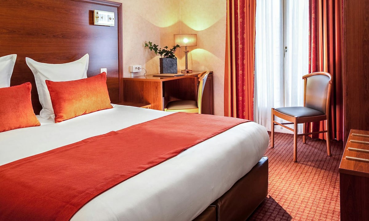 Nuestra luminosa habitación clásica de 14 metros cuadrados ofrece una vista impresionante de la avenida de Tourville. Disponible para una o dos personas, esta encantadora habitación te proporcionará comodidad y suavidad para una buena noche de sueño. ¡La vista, la atención al detalle, la armonía de colores y materiales seguramente te complacerán! Estas habitaciones no permiten la adición de una cuna.
