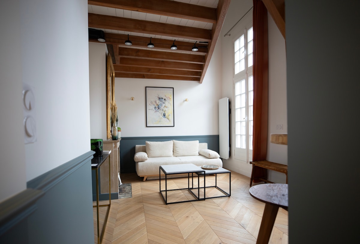 Perfectly located in the heart of the Marais, this newly refurbished, elegant one-bedroom apartment is set in an authentic Parisian building dating back to the early 1700s. It features a bedroom with a queen-size bed and a peaceful view over a private church garden, a living area with a convertible sofa, TV, and kitchenette, and a stylish bathroom with an Italian shower. The metro is less than a 3-minute walk (Line 1), with restaurants, museums, parks, and the Seine just steps away.