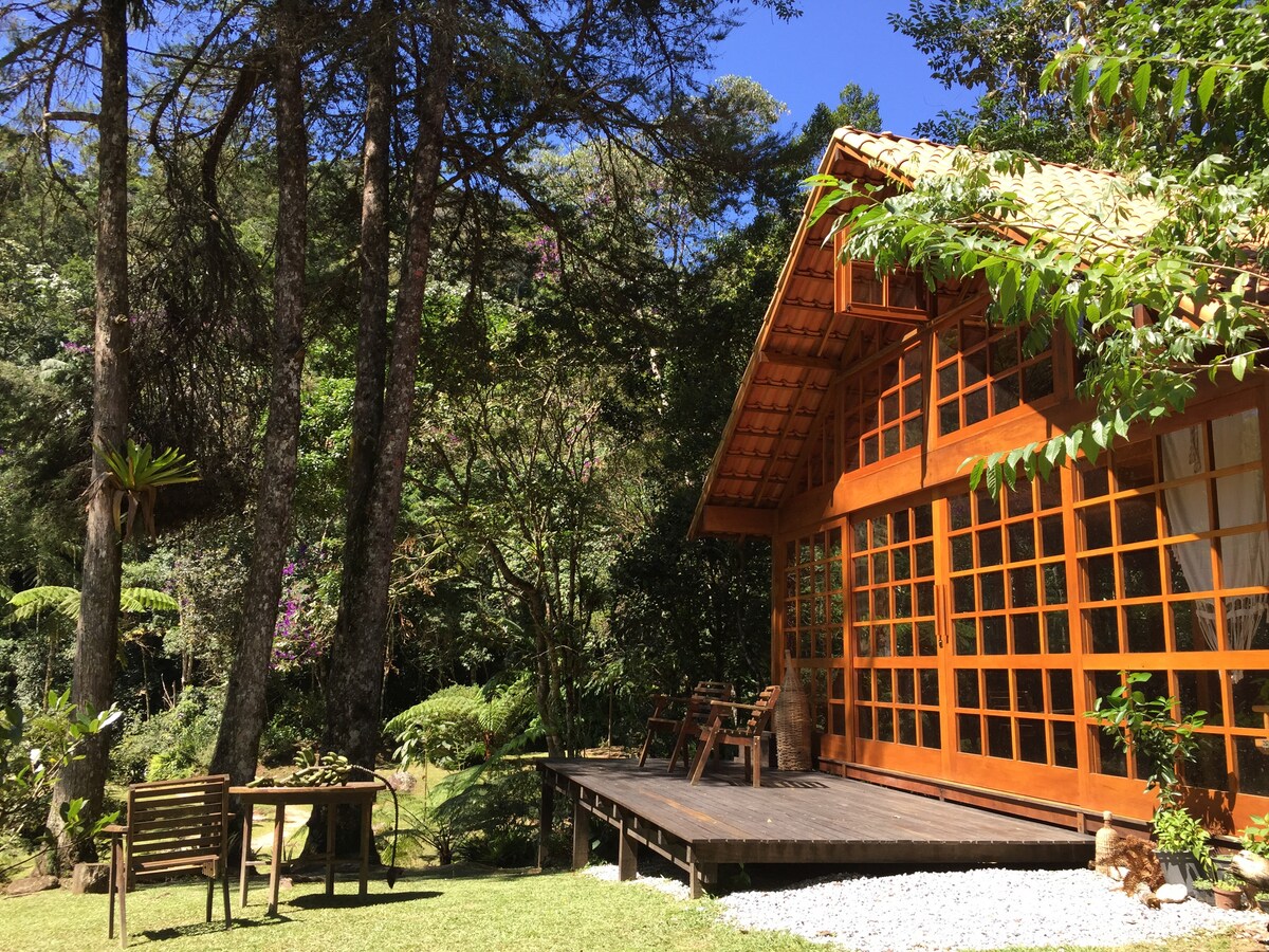 Um chalé aconchegante e privativo, no meio do mato, com muito espaço ao ar livre e rio dentro da propriedade. Possui 2 quartos, banheiro, closet, cozinha equipada, sala com lareira e rede. Perfeito para relaxar e se conectar com a natureza! LOCALIZAÇÃO: - São 2.7km de estrada de terra a partir do km 14 da RJ-142. Não é necessário 4x4. - A 12km de Lumiar, cidade com restaurantes, bares, comércio e cachoeiras. ATENÇÃO: Check-in até 17h, por conta do horário de trabalho dos nossos funcionários
