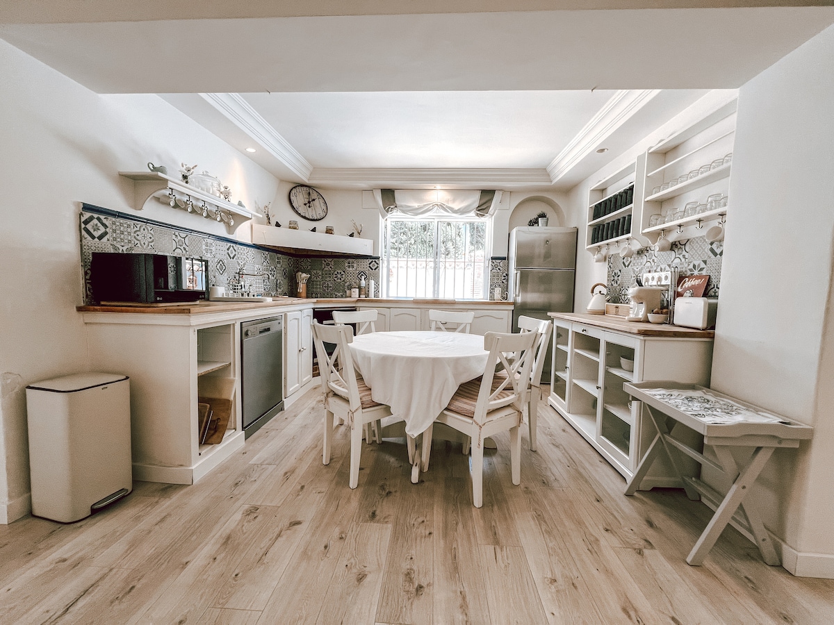 ¡Una villa independiente en una ubicación céntrica en la fabulosa Marbella! ¡Opción de servicio de desayuno diario! ¡A poca distancia a pie de restaurantes, tiendas, la playa y Puerto Banús! Diseñadas con mucho encanto y carácter, todas las habitaciones son espaciosas y están decoradas en un estilo tranquilo, rústico y chique:) Tenemos una gran piscina, jacuzzi, bar al aire libre, descanso al aire libre, cocina completa y comedor al aire libre. Perfecto para cualquier tipo de grupo, como vacaciones familiares, retiros de fitness, retiros corporativos, etc.