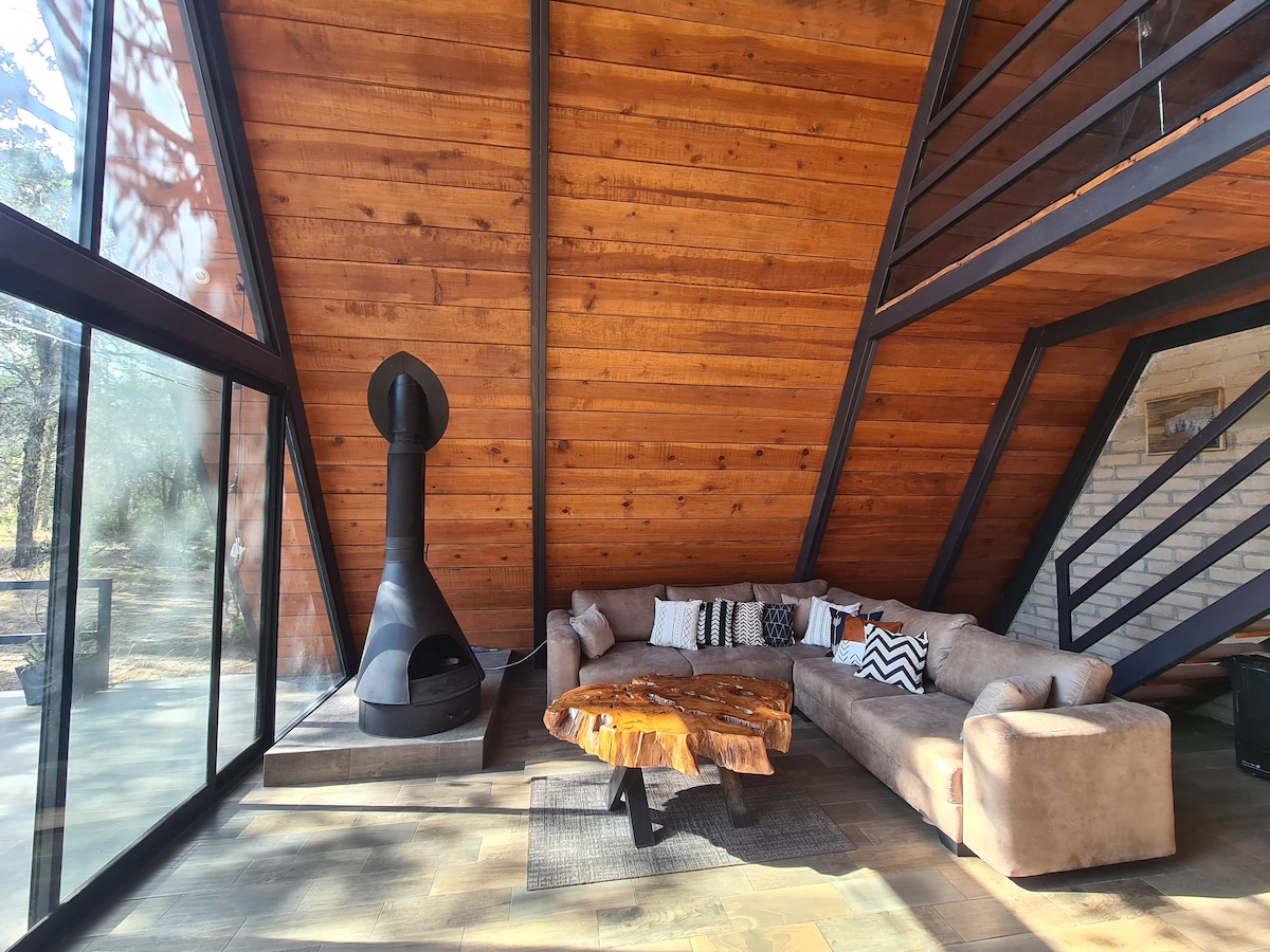Disfruta de un lugar único, en la privacidad de una cabaña alpina ecológica de dos pisos, situada en un terreno de 4 hectáreas de pinos en medio del bosque. Cuenta con 2 amplias recámaras, la superior tiene techo panorámico para disfrutar del increíble cielo estrellado desde la comodidad de tu cama. Además tiene wifi satelital, cocina equipada, amplia área de sala/comedor con ventanal, tapanco con sofá cama, terraza con mesas al aire libre, asador de carbón y área de juegos infantiles.
