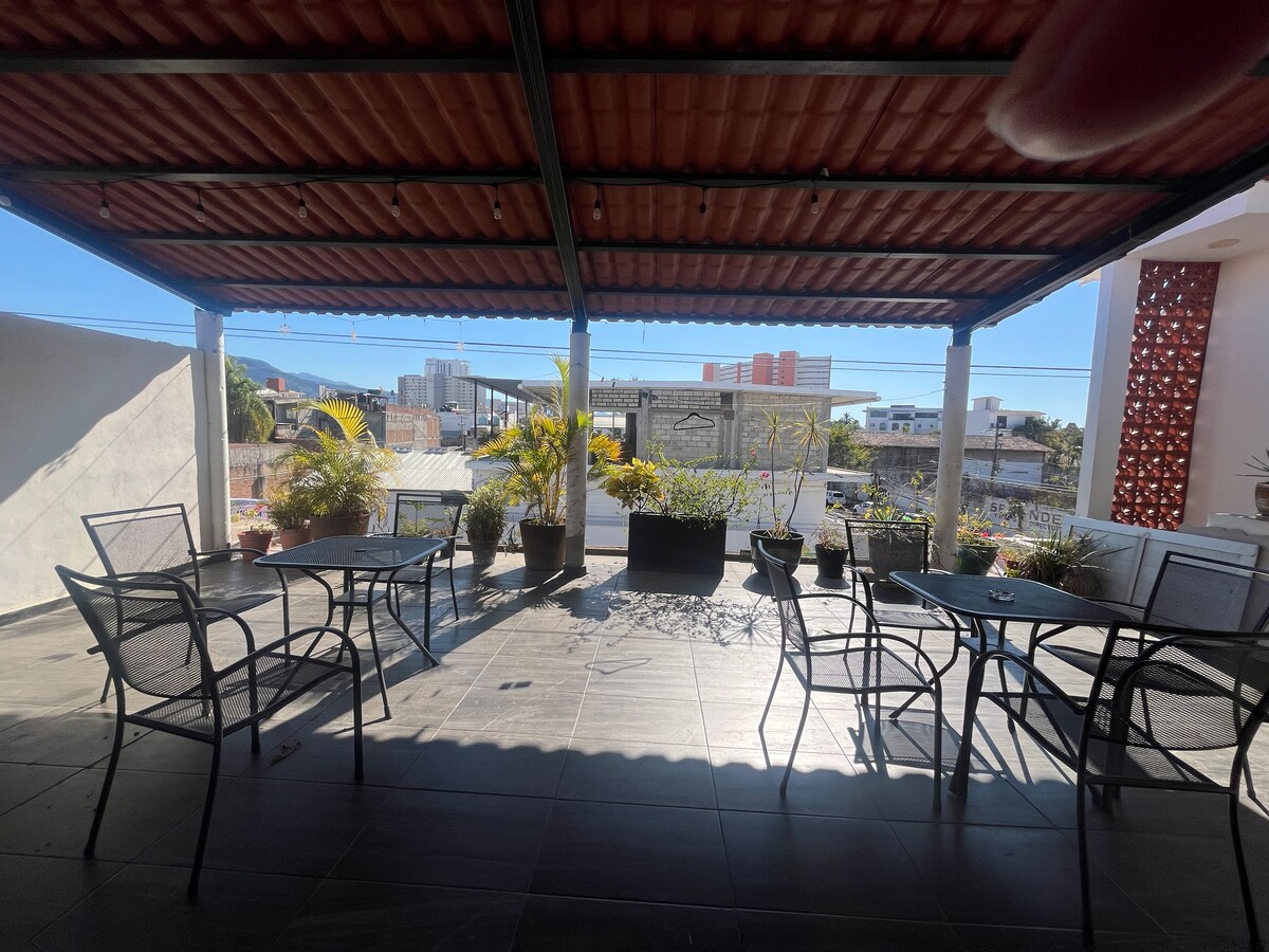 Ven y disfruta de este cómodo departamento que cuenta con una recamara acogedora equipada con aire, baño, sala y cocina a demás podrás utilizar sus áreas comunes con alberca en la terraza y una vista espectacular a las montañas y mar. El Estudio esta ubicado cerca de la zonas céntricas de Vallarta, a solo 5 minutos del malecón, 5 cuadras de la zona hotelera y a 600 mts de la playa. Cerca cuenta con restaurantes, café y tiendas departamentales.
