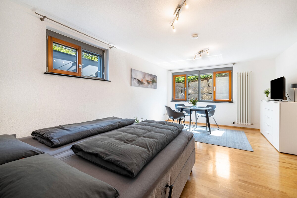 - Amplio apartamento privado de 40 metros cuadrados con terraza y entrada privada. - Cocina totalmente equipada con lavavajillas y nevera/congelador grande. - Cuarto de baño con ducha. - Cómoda sala de estar con sofá de 3 plazas y dos plazas. . Cama doble francesa (140 cm de ancho) - A poca distancia a pie del S-Bahn y la estación de tren regional está a solo 10-15 minutos. - Parada de autobús justo al lado de la casa - Estacionamiento gratuito frente a la casa. - Ubicación ideal para viajes a la Selva Negra, Tübingen y Stuttgart.