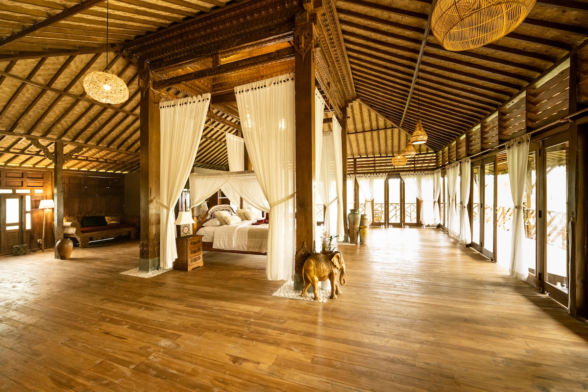 ¡Único en Nusa Penida! Magnífica suite de 180 m2 ideal para una pareja. Situado en el primer piso de una villa con entrada independiente, el dormitorio incluye una enorme cama de 2mx2m, 2 zonas de estar, un sillón colgante, un gran baño. Ventanales y un amplio balcón rodean la habitación, que le ofrece vistas panorámicas a la selva y al mar. La habitación está prevista para 2 adultos, pero se puede organizar un banco para un niño pequeño. O cama extra 1 lugar bajo petición expresa.