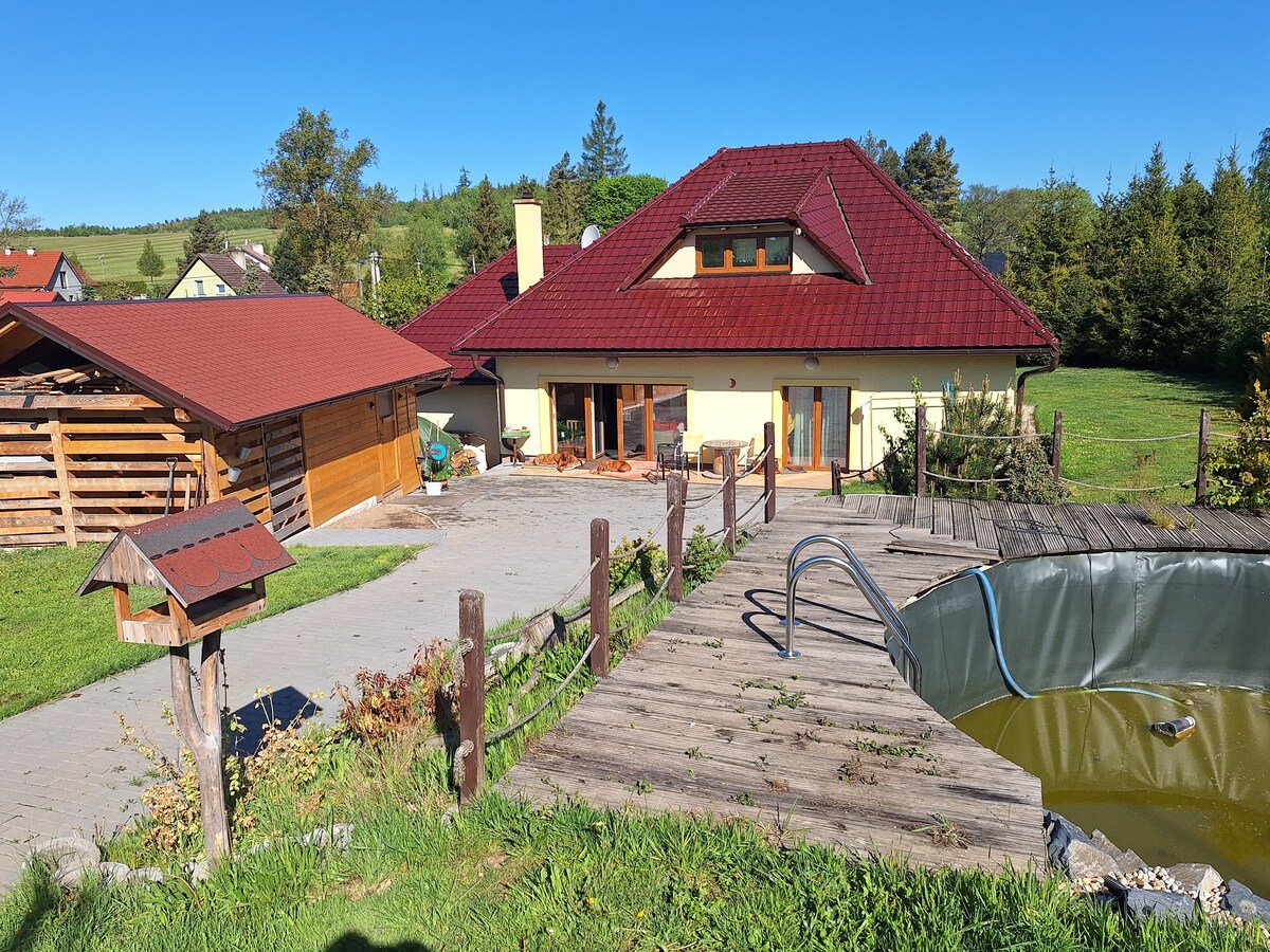 Hola, soy Erwin, una casita con alma. Estoy ubicado en las estribaciones de las montañas Rychlebské, en un pequeño pueblo llamado Bílý Potok, cerca de la frontera con Polonia. Soy anciano desde fuera, pero te ofreceré mi hermosa alma por dentro. Puedo ser tu amigo por un tiempo que te mimará si me tratas bien. No me gusta el mal tratamiento y el humo del cigarrillo no me hace nada bueno. En mi alojamiento, te relajarás y recargarás mucha energía positiva.
