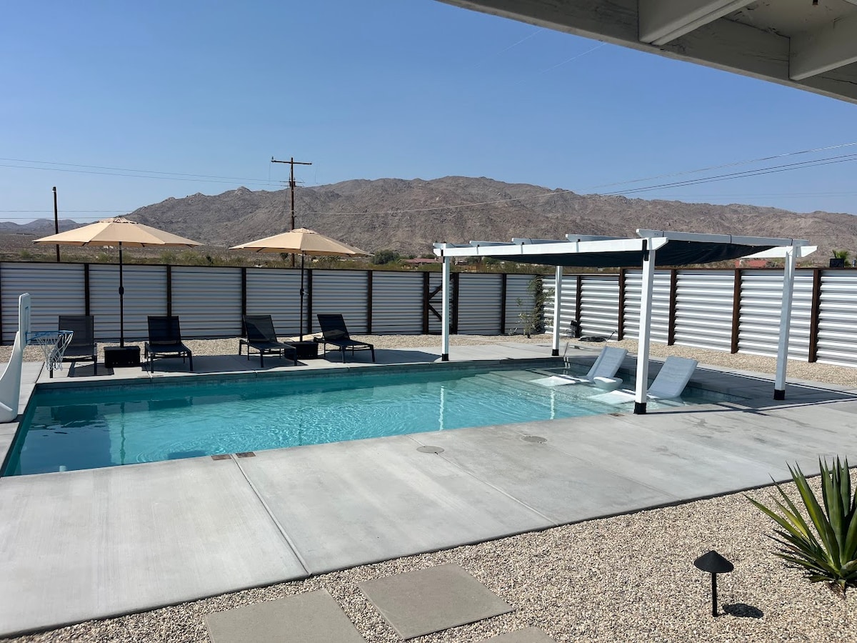 Sumérgete en las vistas panorámicas de las montañas y el ambiente sereno en Desert Sage, una escapada de mediados de siglo a solo 3 minutos de Joshua Tree Park. El lugar perfecto para un máximo de 5 amigos para relajarte y relajarte. Disfrute de 2 dormitorios tamaño queen y una tercera habitación con un sofá cama doble y espacio de escritorio. Con una espaciosa bañera de hidromasaje, fogata de propano, hamacas, piscina de superficie de temporada, comedor al aire libre y amplios lugares de descanso, esta pequeña y elegante propiedad tiene todo lo que necesitas para el refugio perfecto en el desierto... ¡y aceptamos mascotas!