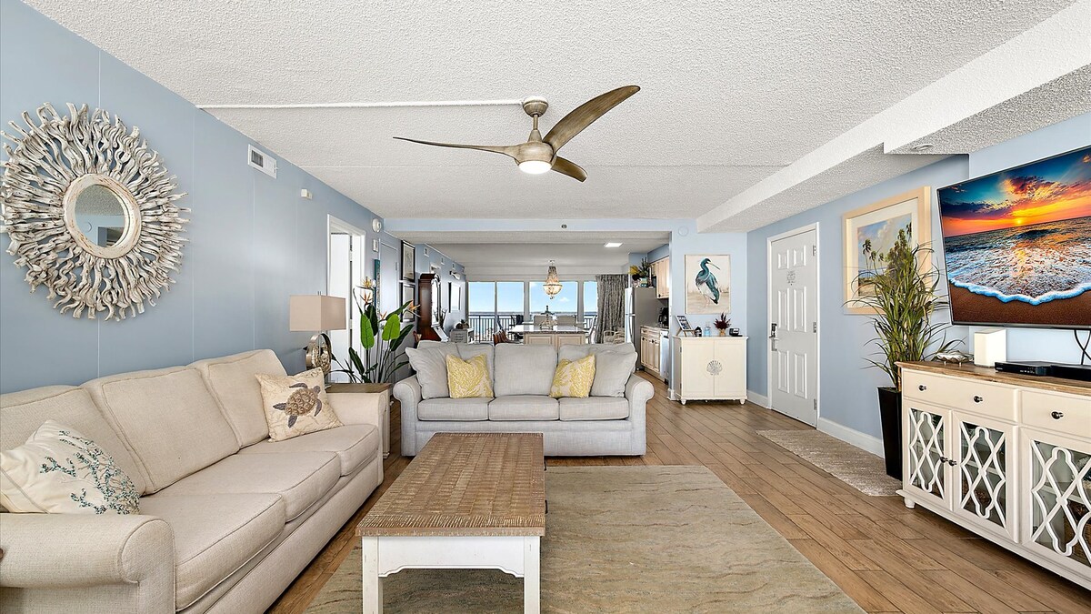 ¡Este alojamiento ofrece todo lo que quieres para unas vacaciones perfectas! ¡Hermoso y espacioso apartamento de 3 dormitorios y 3 baños con muchas actualizaciones modernas para tu disfrute! Cómodo para un máximo de 12 huéspedes. Decorado y amueblado con buen gusto, con cómodas camas, sofás y sillas. ¡Cocina gourmet recién renovada con electrodomésticos de acero inoxidable! Balcón extragrande con vistas al paseo marítimo y a la playa. Cuando no estés en la playa, disfruta de la piscina, las vistas al mar y el amanecer. Estás a solo 15 pies del paseo marítimo, ¡tan maravilloso para observar a la gente!