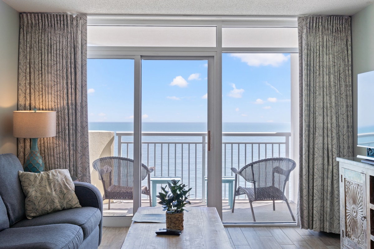 A bright, modern oceanfront retreat where everything feels simple and comfortable. Enjoy open views, a clean design, and an easygoing space made for slowing down by the sea. Top 5% rated in Myrtle Beach 🌴 Oceanfront Luxury — Seawatch Resort 1003 North Tower • 🌊 Floor-to-ceiling ocean views that make the beach feel front and center • 🛋 Bright, modern living space designed to feel open, simple, and comfortable • 🛏 Private bedroom with a comfortable king bed for restful nights • 🍳 Fully equ