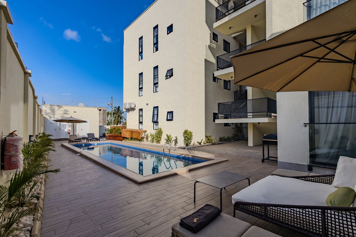 Acogedor 1BR en East Legon con balcón y piscina en la azotea