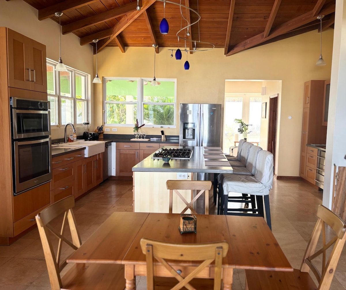 Relájate con familiares y/o amigos en este lugar tranquilo para hospedarse. La casa está situada en un barrio tranquilo, a pocos minutos de tiendas, restaurantes y hermosas playas. Es un lugar perfecto para relajarse y tomar el sol o para volver a casa después de explorar todo lo que la isla tiene para ofrecer. La casa tiene una gran cocina totalmente equipada con vistas a la piscina y al mar. La piscina tiene un extremo poco profundo con asientos incorporados para relajarse y un extremo profundo para saltar y jugar.