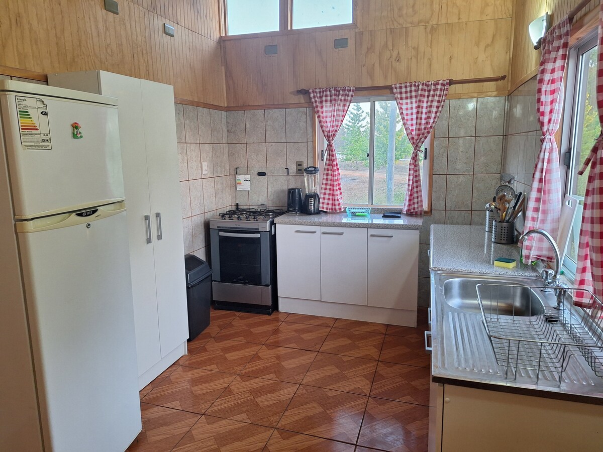 Casa de 80 metros cuadrados , que ofrece todo el confort en un lugar de campo, con vigas a la vista y piso flotante, con estufa a leña ecológica Amésti , 3 dormitorios, 5 camas, amplísimo living comedor . baño con tina, cómoda cocina americana, hermoso quincho techado de uso exclusivo , con su propio hot tub privado. Casa ideal para los amantes de la naturaleza , tranquilidad y para disfrutar en familia, con amplios espacios de áreas verdes. Hermosas vistas. Recinto muy seguro.