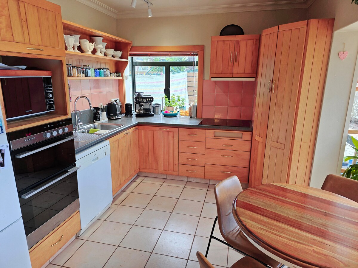Nuestro alojamiento está cerca de campos deportivos, playa, cafetería y paseos por el monte. Te encantará nuestro alojamiento por las modernas instalaciones y la oportunidad de experimentar la verdadera hospitalidad kiwi. Nuestro alojamiento es ideal para parejas y viajeros de negocios. Tienes tu propia entrada privada y aparcamiento. Hemos construido esta moderna casa para que se separe en dos apartamentos divididos por puertas de privacidad. El apartamento tiene muchas características que te encantarán. En invierno, el fuego de leña mantiene el lugar cálido y acogedor.