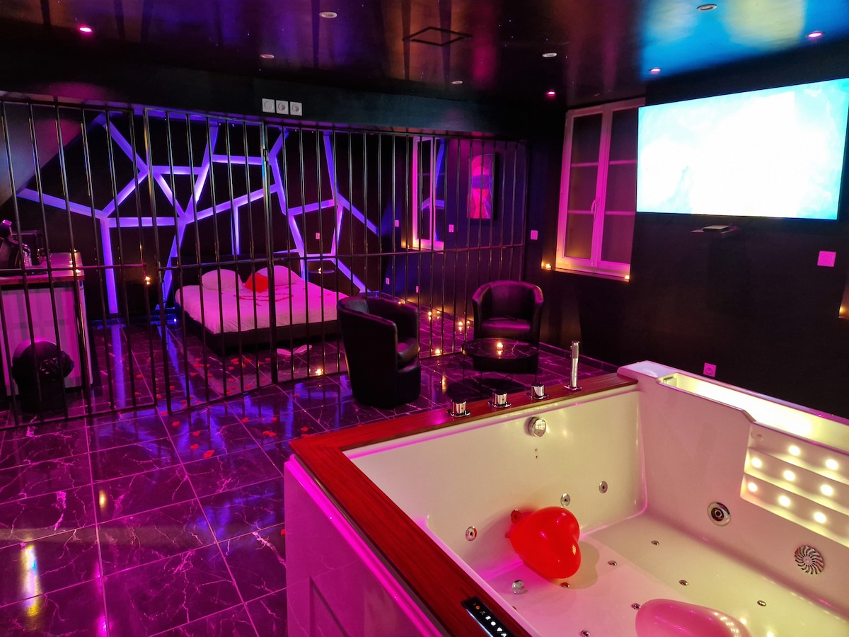 💋 Découvrez notre suite Coquine, un véritable nid de plaisir… 💋 Un lieu discret et envoûtant, pensé pour réveiller vos fantasmes et laisser libre cours à vos envies les plus audacieuses. 💦 Un jacuzzi 2 places pour des instants de détente et de plaisir à deux 💺 Un siège massant, pour éveiller les sens en douceur 🪞 Un miroir au plafond pour une touche de sensualité et de jeux 💡 Ambiance tamisée, déco sensuelle, Laissez-vous aller, c’est VOTRE moment.