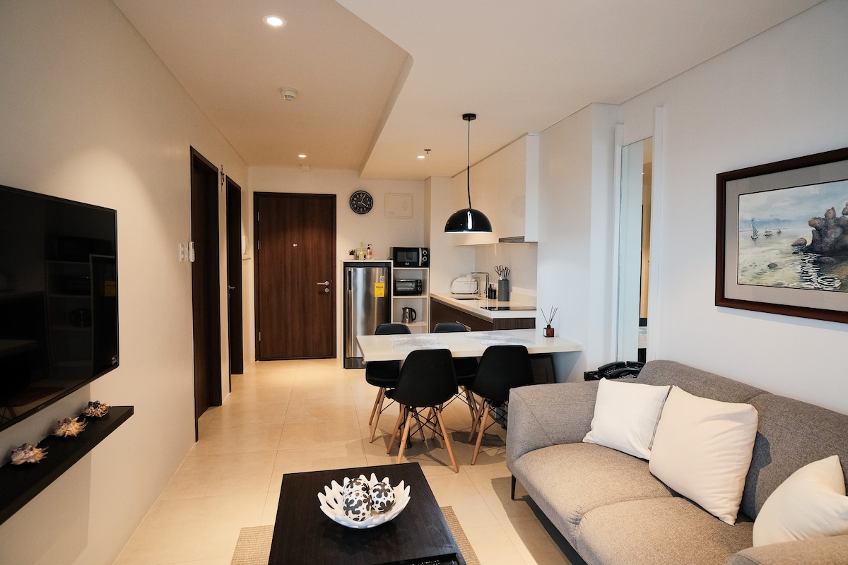 Relax in this entirely cozy, modern and vibrant 1BR condo unit that is conveniently located in ONE MANCHESTER PLACE, Mactan Newtown, Lapu-lapu City. Where it is close to 5 star resorts, restaurants, coffee shops, and supermarket. - 10-15 min drive away from Mactan Airport -Smart Lock Access - 50 Mbps WIFI - Free Netflix - Fully Equipped kitchen (IMPORTANT NOTICE: Kindly review the property descriptions below before making your reservation)