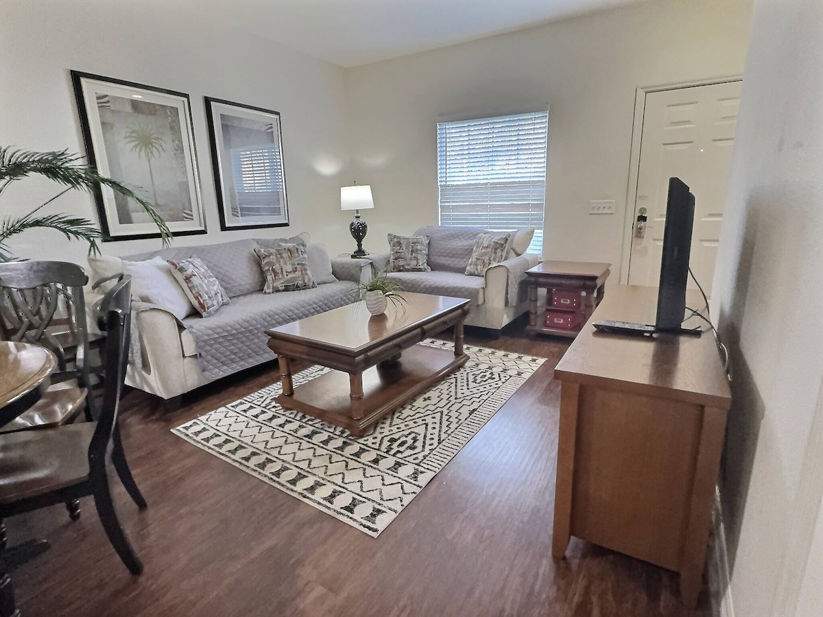 *SE ADMITEN MASCOTAS Y NIÑOS* *Se aceptan inquilinos para estancias largas* ¡Adosado de 2 dormitorios y 2,5 baños en una comunidad cerrada! A 10 minutos de Disney, a 20 de Seaworld y a 30 de Universal Studios. La comunidad incluye una gran y hermosa piscina climatizada y un parque infantil/zona de barbacoa. Servicios de limpieza profesional después de cada estancia. Cocina totalmente equipada con café Keurig, todos los platos, utensilios, condimentos, etc. Todos los baños están totalmente equipados con artículos de aseo y muchas toallas adicionales. El patio incluye sillas, parrilla de gas y zona de estar.