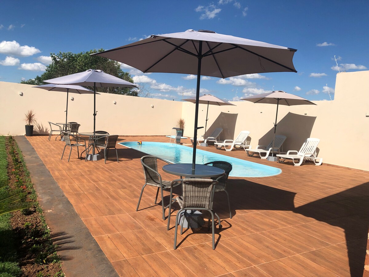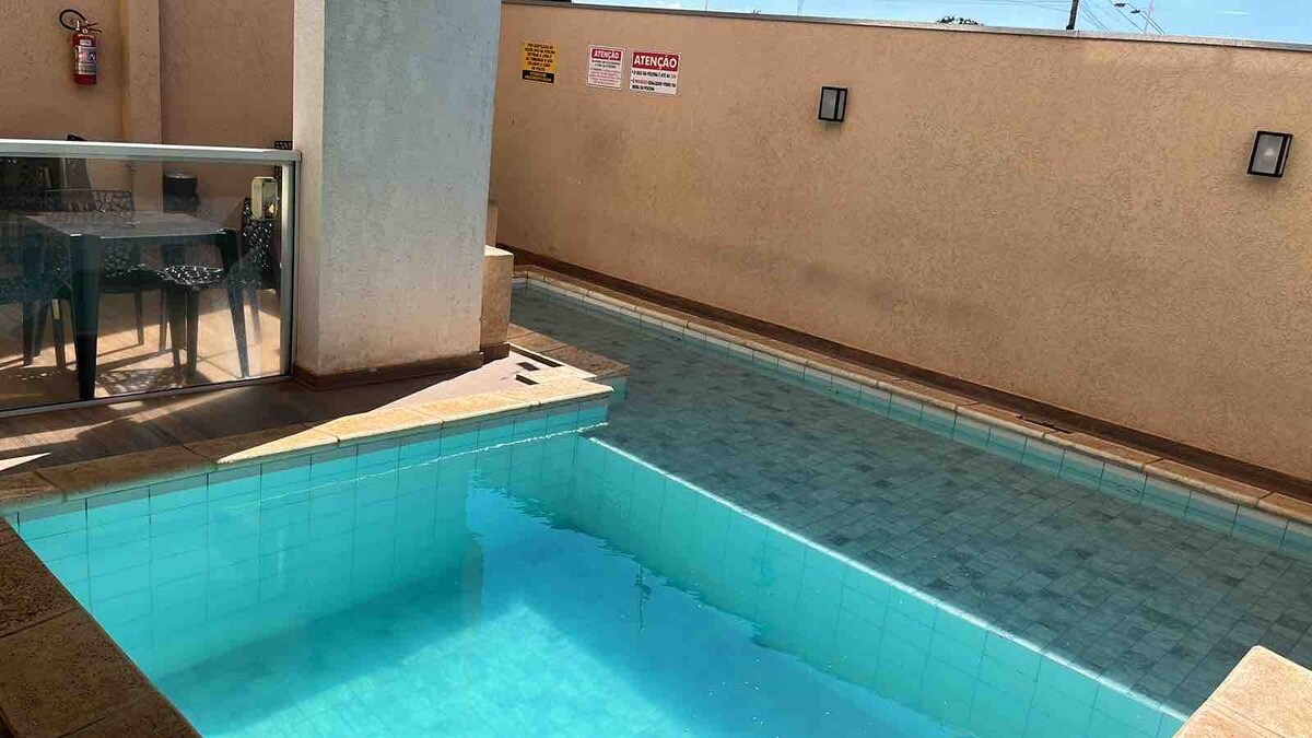 El apartamento está situado en la región de Olimpia, cerca de los parques acuáticos Thermas dos Laranjais y Hot Beach. El alojamiento cuenta con: - Wifi gratuito - Zona de barbacoa privada y con un excelente espacio para mascotas - Aire acondicionado - Utensilios de cocina - Piscina climatizada con calentador solar, que se puede utilizar a voluntad. (Piscina compartida de condominio). Junto al piso hay un restaurante de pescado - Comida rápida como: McDonalds, Subway, Burger King - Bares y restaurantes de gran calidad.