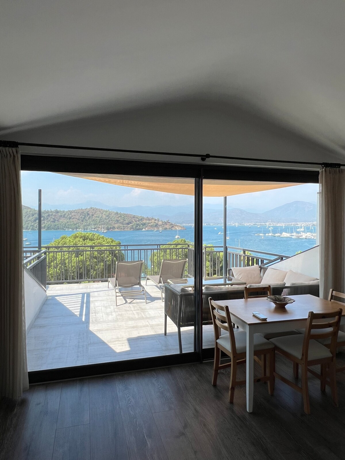 Tranquilo piso en la planta superior con una amplia terraza con vistas a la bahía, el tipo de vistas que te hacen dejar el teléfono. El espacio es sencillo, limpio y está equipado con lo que necesitas para una estancia corta. La zona es tranquila, pero está a solo 10 minutos a pie de la ciudad o a un corto trayecto en coche de las playas. También hay una ruta escénica por el bosque hasta el pueblo abandonado de Kayaköy. Vivimos cerca y tratamos de mantener todo tranquilo, atento y discreto para que puedas disfrutar de tu estancia.