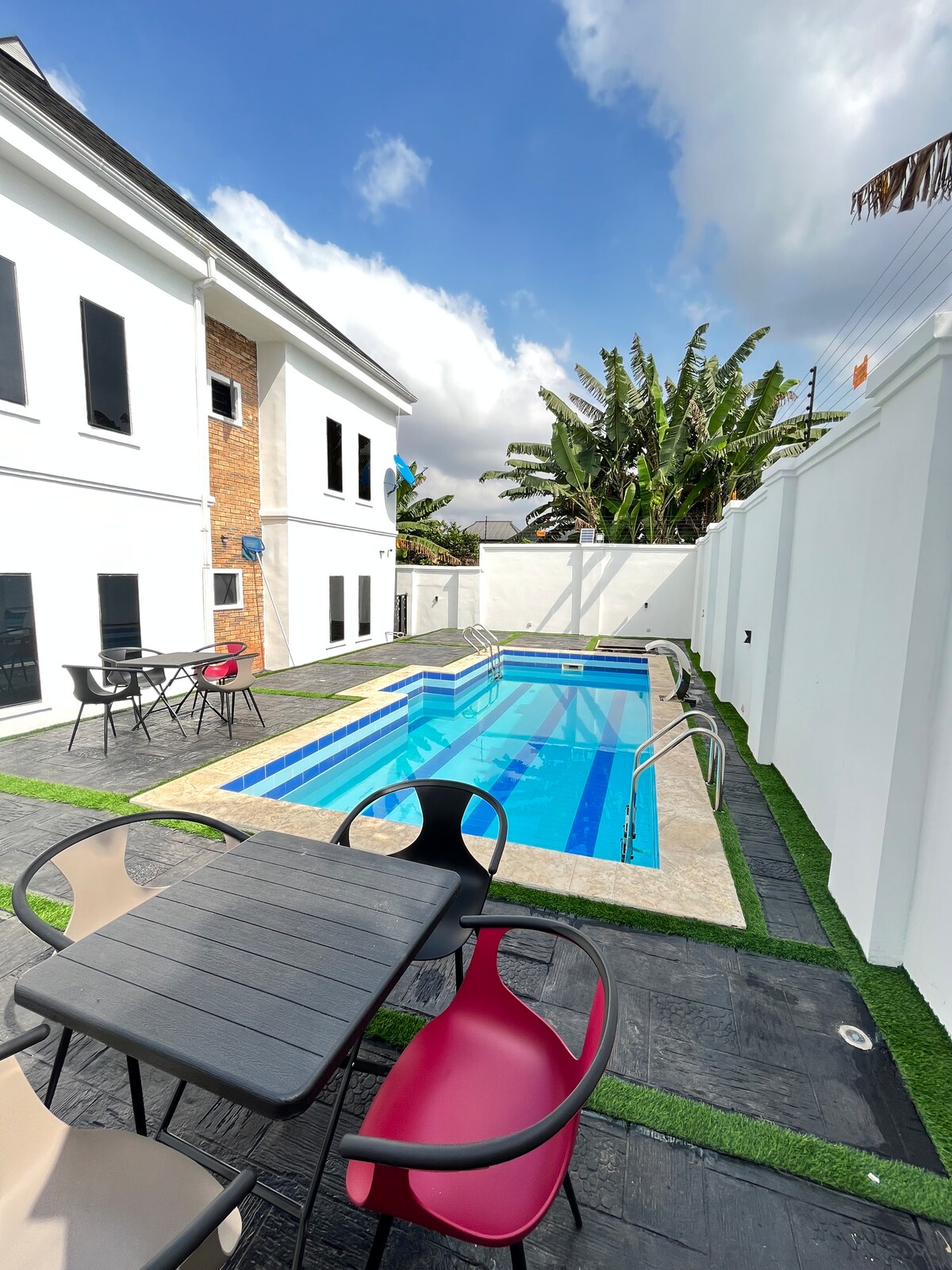 Un bien construido apartamentos de 2 dormitorios con servicios en un entorno de repositorio no muy lejos del aeropuerto con carretera alquitranada a través del aeropuerto al edificio principal y también de alagbaka al edificio principal con las siguientes características : Amplio espacio de estacionamiento Unidad de aire acondicionado central para sala yventiladores para habitaciones Generador de espera. Ambiente condusivo. TV inteligente de 50 pulgadas. Sofá moderno Cocina de gas y horno Recogida en auto en el aeropuerto/otros Solicitud de servicio especial