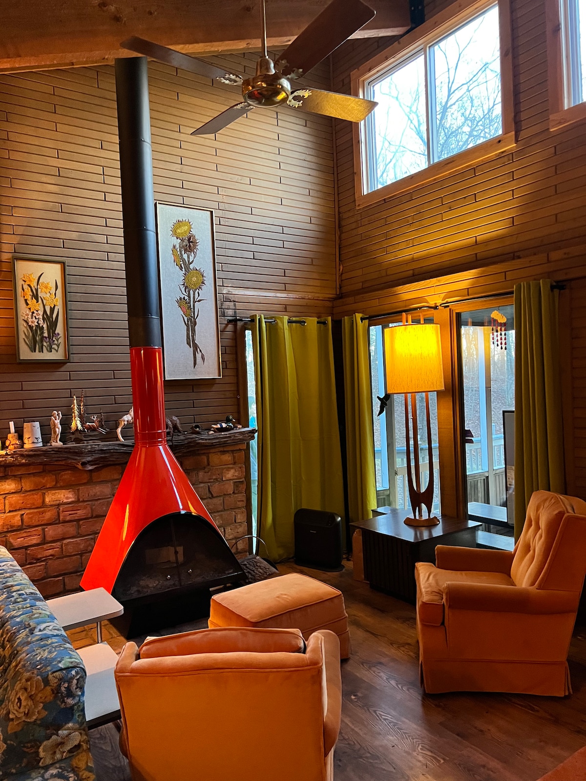 Cabaña de secuoyas de tres dormitorios construida a medida en 1975 en las dunas. Líneas de MCM, muebles vintage, chimenea Malm de los años 60, pinball Stern Lord of the Rings, gran fogata al aire libre. ¡Sube a la Duna para enamorar de nuestro mágico trozo del Lago Michigan! *¿Necesitas más espacio? Pregunta por agregar nuestra Riverside Retro Camper, que tiene capacidad para seis personas con cocina y baño por $ 100 por noche, $ 400 por semana. (Fotos previa solicitud).