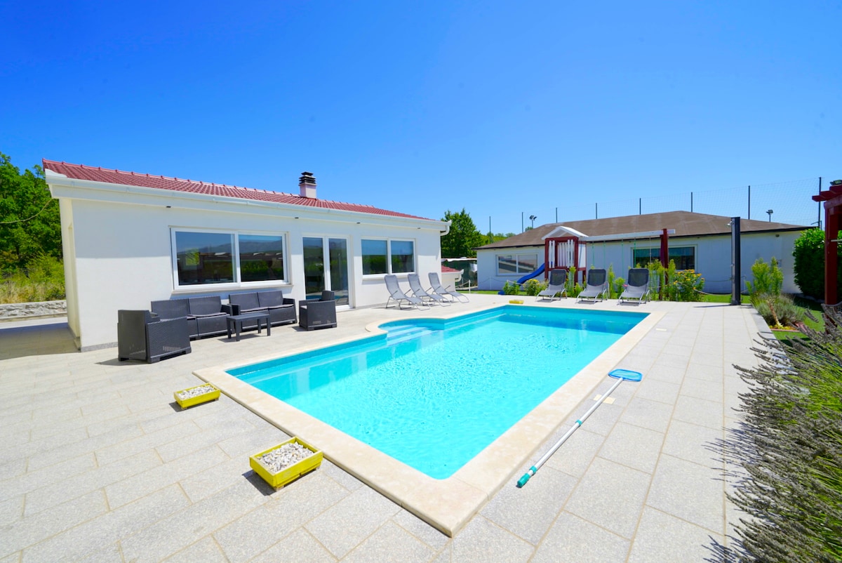 ¡VILLA ENTERA SOLO PARA TI ! VILLA ROMÁNTICA ubicada en un lugar verde ytranquilo, Dugopolje Nada en UNA PISCINA CLIMATIZADA yrelájate en el JACUZZI. Colócate bajo el sol,escucha el sonido de la fuente Parrilla bajo el árbol ¡Trampolín, fútbol de mesa,dardos, 5 bicicletas, TODO PARA TI ! Genial, todo está cerca: Sal de la autopista A1: 3 km LA PLAYA se llama ŽNJAN: 15 km. City SPLIT-16km Puerto de ferry de SPLIT para visitar las islas BRAČ,HVAR, VIS-19km ANTIGUA SALONA: 9 KM FORTALEZA KLIS(Juego de Tronos): 6km Perfectamente cerca,pero lo suficientemente lejos para tu paz y privacidad Disfruta de tus vacaciones.