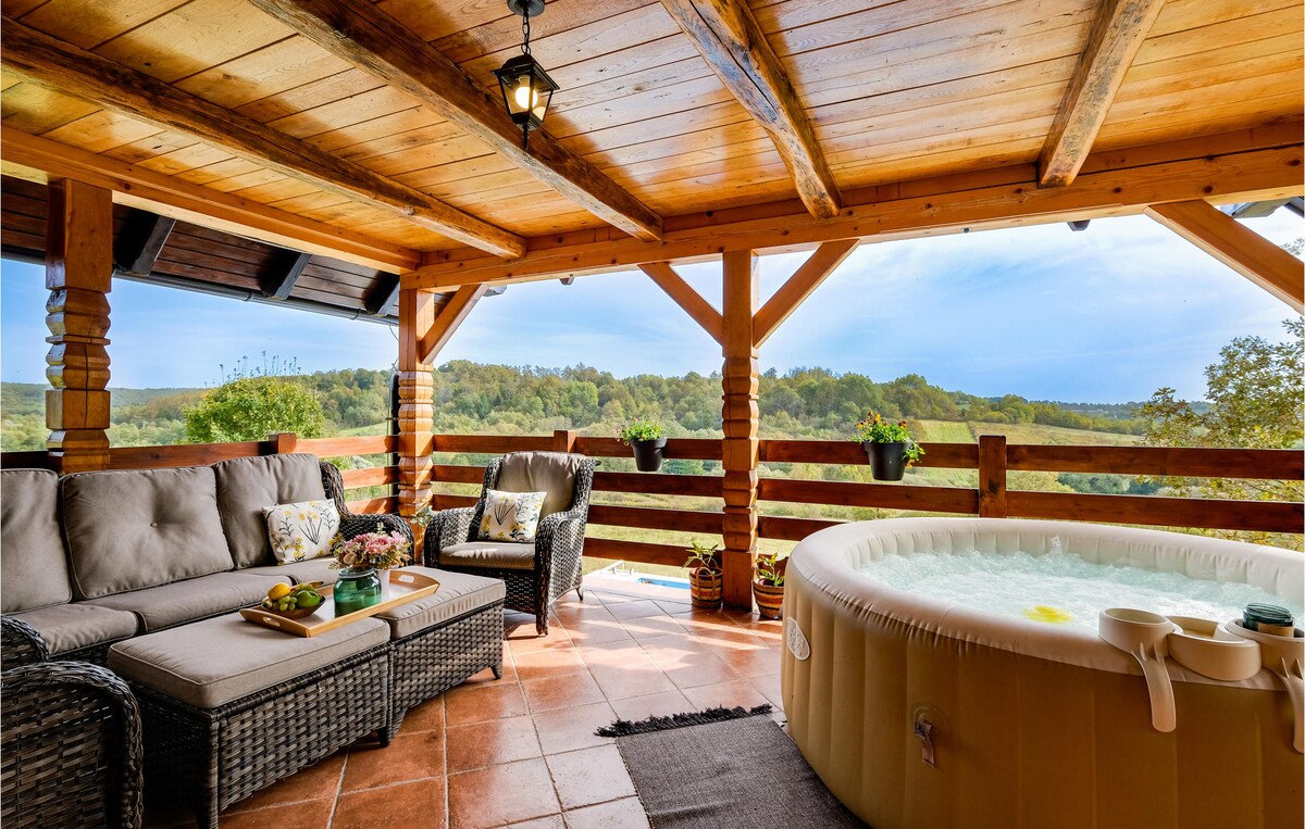Forest Home 02 is located in the unspoiled nature of Vukomeričke Gorice, surrounded by forests and greenery. The blend of traditional and modern style makes it ideal for families with children, and pets are welcome. In colder days, enjoy the wood fireplace and heated jacuzzi, and in summer the pool (15 May–15 Oct). A barbecue, billiards, and darts are available, and the surroundings offer forest trails, cycling, fishing, and horseback riding. Nearby are Krašograd and Jamnica, picnic area.