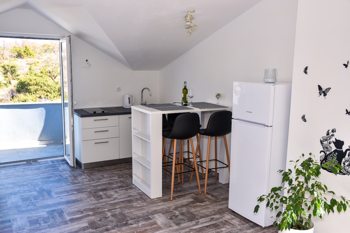 Departamento nuevo y moderno en una ubicación tranquila a 2 km de la playa. Desde el centro de la ciudad de Dubrovnik, a 25 km y a 30 km del aeropuerto.