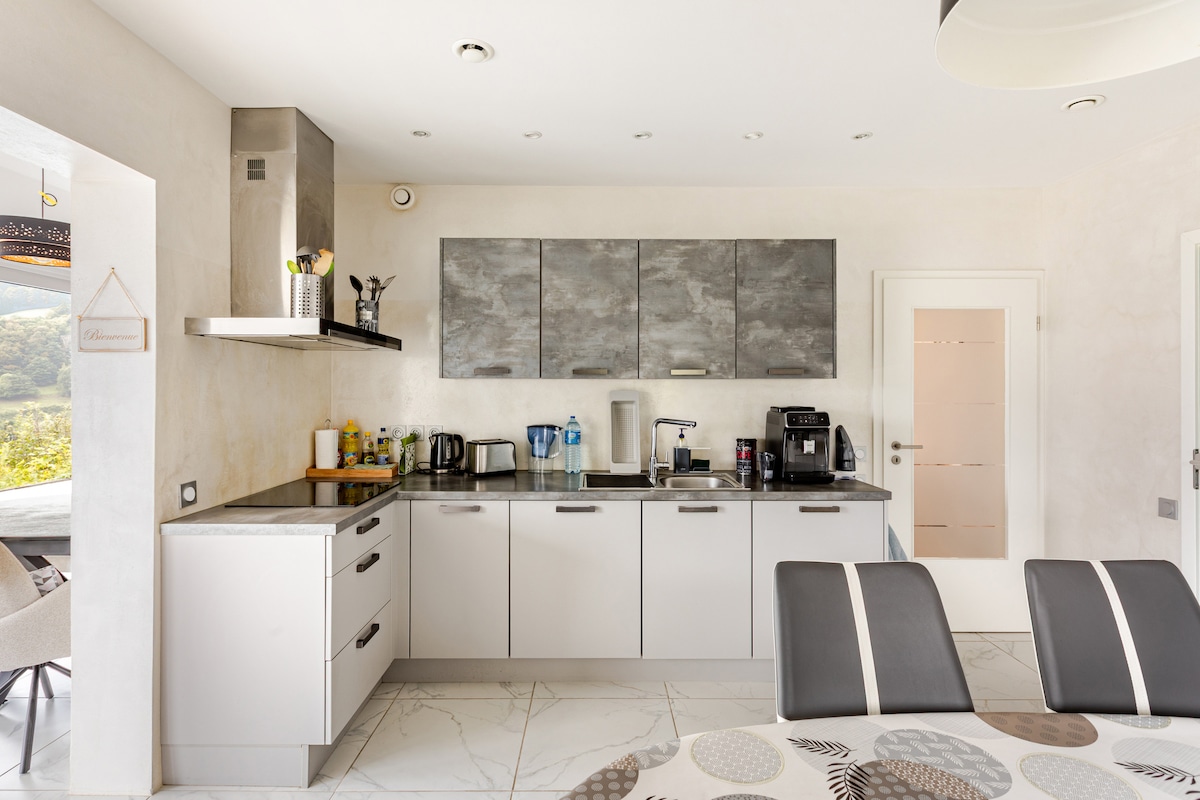 Casa de arquitecto en Fréland en un pueblo de montaña , a 10 minutos de Kaysersberg, a 20 minutos de Colmar, Riquewihr y las pistas de esquí del Lac Blanc. Con una ubicación ideal para las actividades de montaña (esquí y senderismo) , los mercados navideños, la visita de toda Alsacia y nuestro hermoso viñedo. Magníficas vistas sin vecinos, podrá disfrutar del jacuzzi en la terraza. La casa está equipada con productos de alta gama. A su llegada, siempre encontrará lo mínimo necesario.