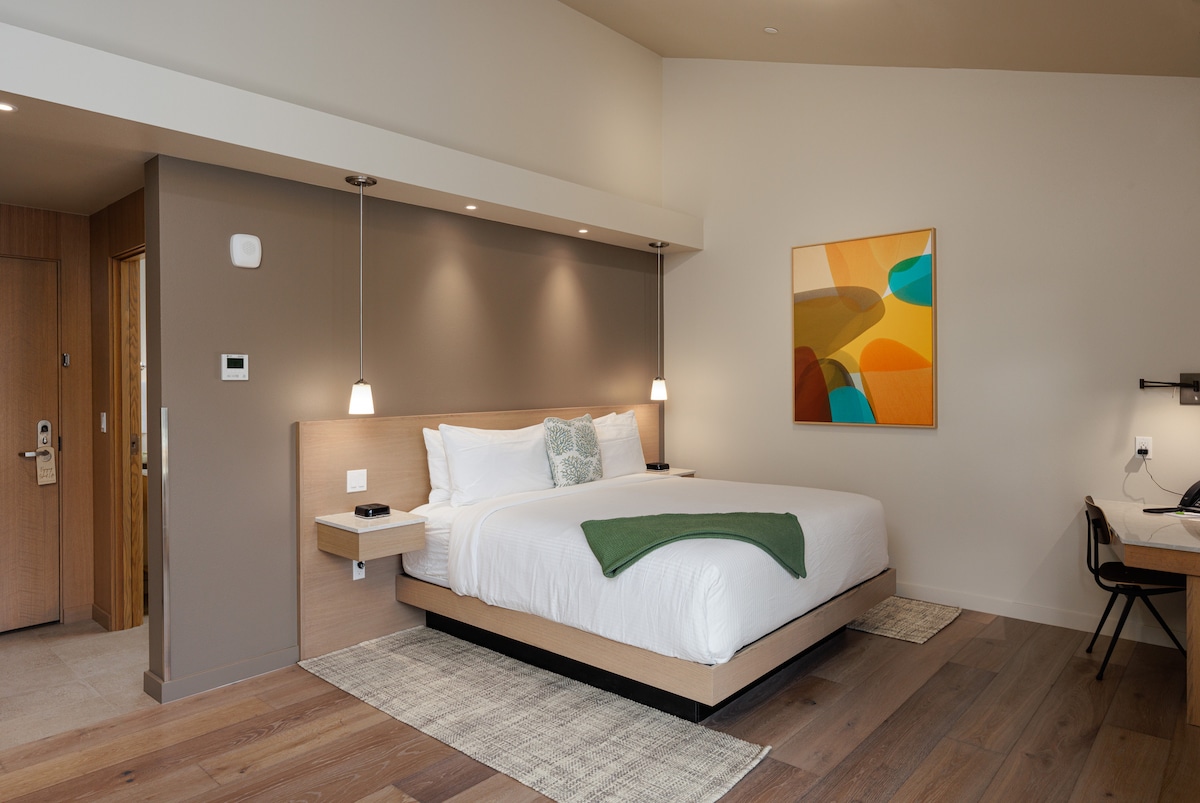 Luxury King Hotel Room más sofá cama doble con vistas parciales al agua de Eastsound Bay y el pueblo circundante de Eastsound en Orcas Island, WA