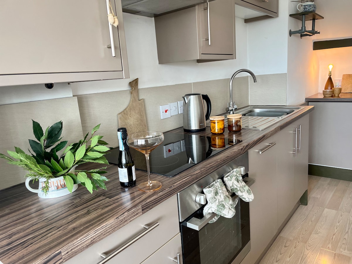 Boutique skyline apartment with private parking for 1 vehicle is nestled on a quiet leafy street in the centre of Taunton. It has far reaching views across Somerset and the hills beyond where stunning sunsets can be enjoyed whilst sipping a glass of fizz which will be waiting on your arrival. Perfect for a cosy weekend or provides a great workspace with excellent WiFi. The double bed is very comfortable made up with beautiful pure cotton and linen sheets. ( There are 3 flights of stairs )