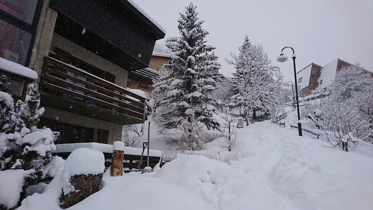 Estudio muy soleado grd balcón con impresionantes vistas a las montañas cerca de todos los servicios a 300 metros (remontes, piscina, bolera, pista de patinaje sobre hielo, restaurantes, cine, bares y salidas de senderismo) Cocina totalmente equipada, tv, baño y aseo separados, zona de montaña para 2 personas, un sofá cama convertible para 2 personas. Aparcamiento privado y taquilla para esquís. Se proporciona ropa de cama, excepto toallas de baño. No se admiten mascotas.