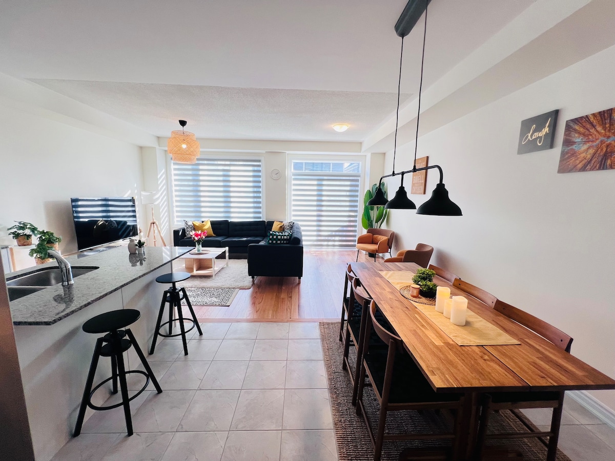 ¡Bienvenido a tu hogar lejos de casa! Una casa de lujo limpia, acogedora y excepcionalmente decorada situada a las afueras del centro de Whitby y a pocos minutos de las autopistas 401 y 407. Esta moderna casa adosada cuenta con toneladas de decoración llamativa y está llena de todas las comodidades que tu corazón pueda desear. Equipada con 2 camas tamaño king, 2 camas tamaño queen y 2 sofás completos, esta moderna casa adosada es perfecta para una familia de tamaño mediano a grande o un grupo de amigos o socios que buscan la estancia perfecta a corto o largo plazo.