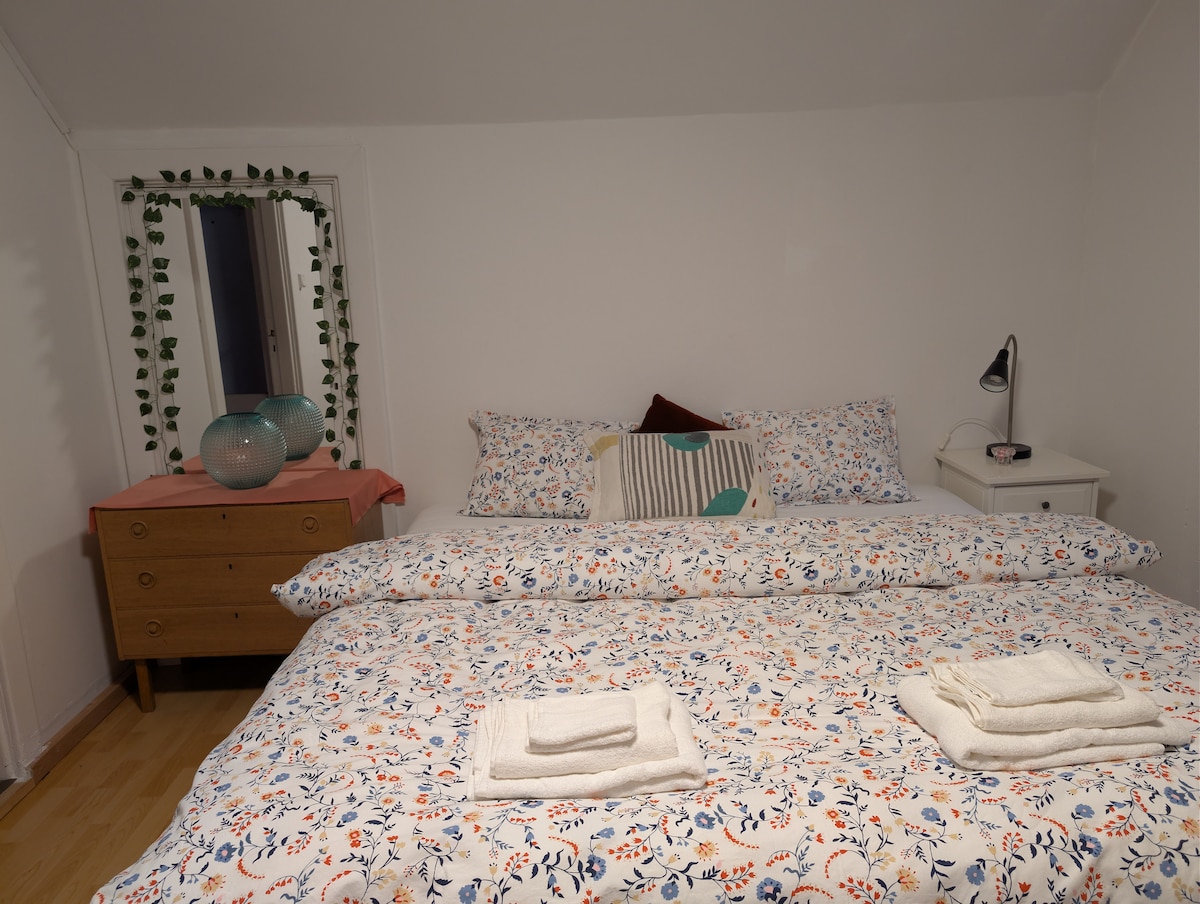 ¡Te damos la bienvenida a tu cómodo hogar lejos de casa! Apartamento luminoso en el primer piso con entrada privada y aparcamiento gratuito (carga de vehículos eléctricos disponible por un cargo adicional). Cuenta con una cocina totalmente equipada, un cómodo dormitorio con puertos de carga, una sala de estar con televisor inteligente (Netflix/Chromecast) y un sofá cama para un espacio adicional para dormir. Baño limpio con ducha y toallero calentador. Perfecto para parejas o familias pequeñas que buscan comodidad, privacidad y opciones de viaje sostenibles.