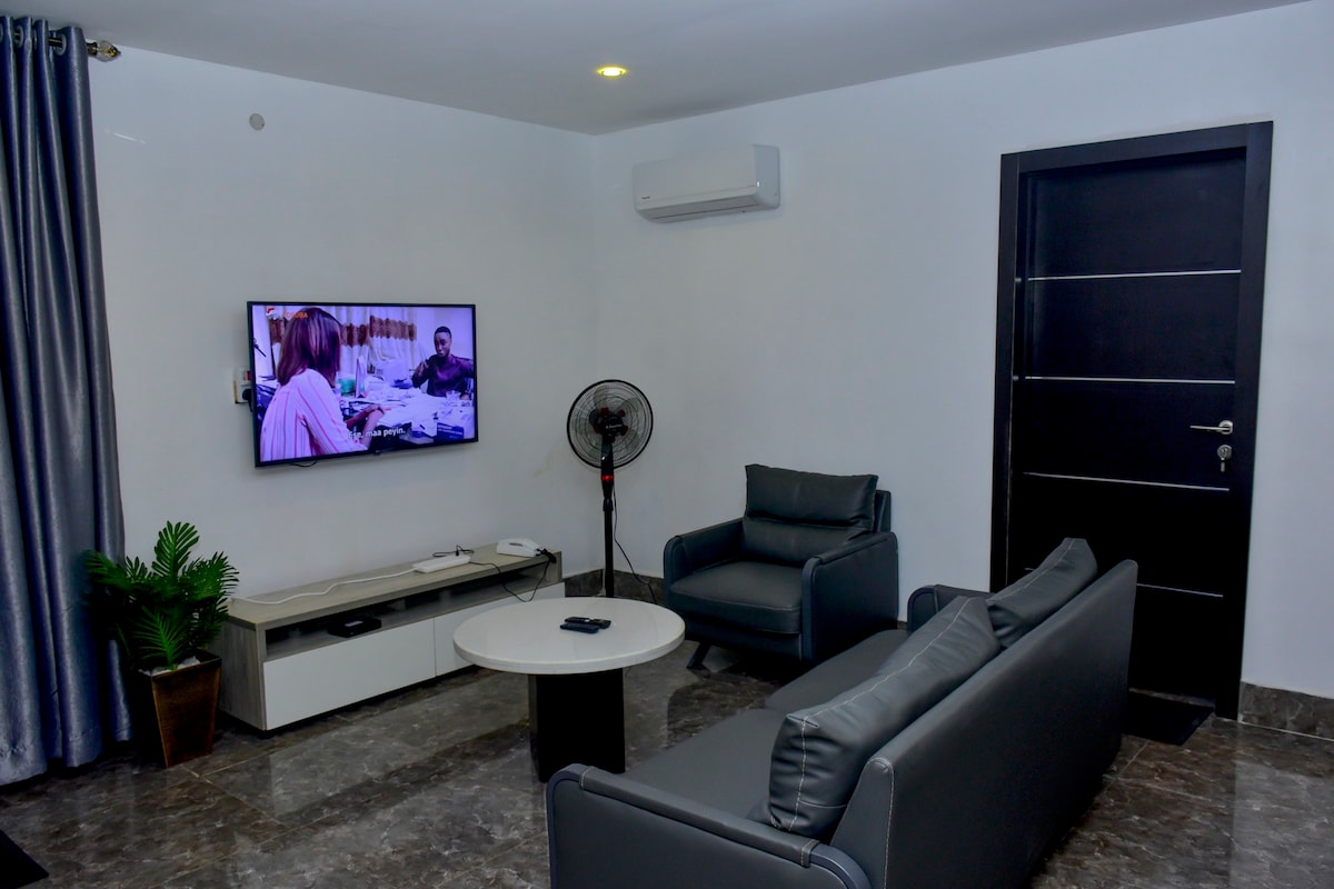 Amplia sala de estar y habitación real con cama tamaño king, baño moderno y aseo🚽. Apartamento muy limpio y estándar. Royal Pent House te ofrece todas las comodidades modernas más allá de tu imaginación con wifi de alta velocidad ilimitado, TV inteligente de 43 pulgadas en el dormitorio y TV inteligente de 55 pulgadas en la sala de estar, YouTube, Netflix, DSTV. Cómodo sofá, calentador de agua, hervidor de agua, microondas, gas para cocinar. Alarma de humo, alarma de dióxido de mono, energía 24/7. CCTV, máxima seguridad con personal de seguridad las 24 horas, 7 días a la semana.
