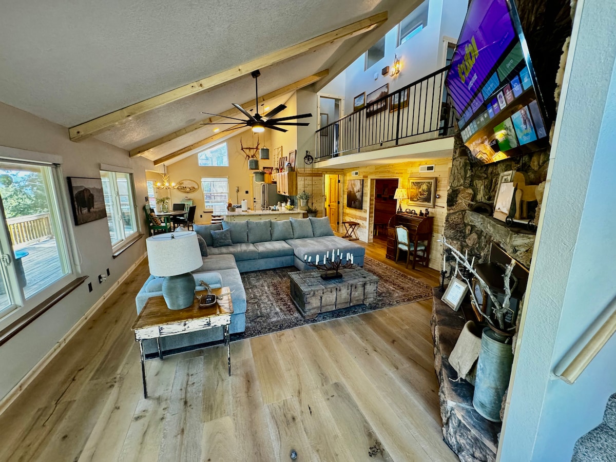 Fully remodeled open concept cabin. Features 3 private bedrooms, a large private bunk room that has a separate living area with 3 full size bunk beds, an open kitchen, family room area, and 3 full bathrooms . Outside you will find a beautiful covered wrap around deck featuring bbq grill, hot tub, and plenty of seating to enjoy breathtaking views. Accommodates 8-12 comfortably. The yard is zeroscaped including turfed areas for lawn games and an outdoor fire pit. NON-SMOKING cabin and no pets.