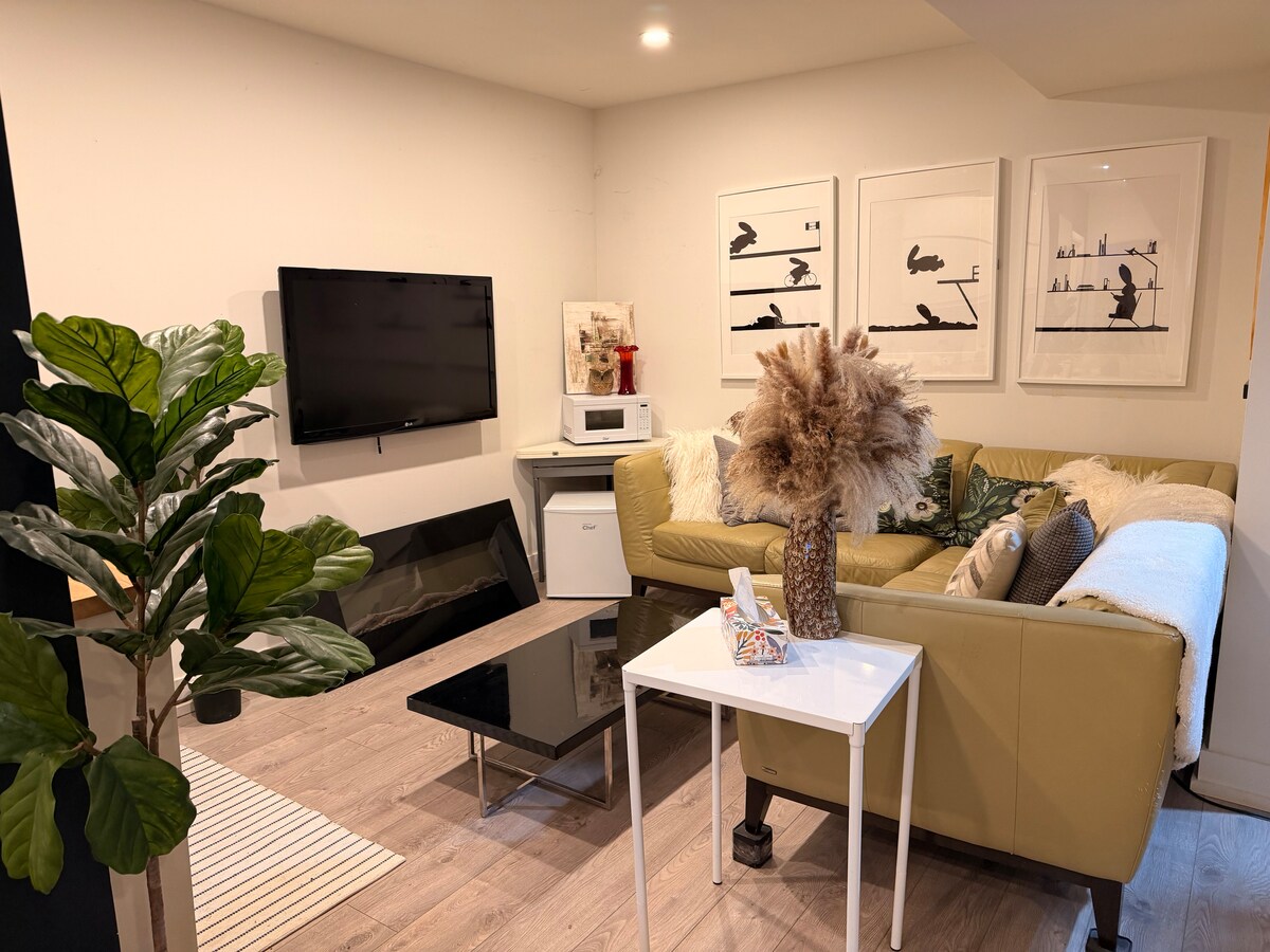 Propiedad única y moderna con amplio estacionamiento, chimenea de leña, gran balcón privado. A pocos pasos de todos los lugares de interés/atracciones y tiendas. Es acogedora, bien mantenida y limpia. Las ventanas orientadas al sur ofrecen mucha luz natural. Las habitaciones son amplias y tienen vestidor y almacenamiento. Colchones tempurpédicos de alta gama y sofá cama Sealy. La cocina y los baños están equipados con todos los elementos esenciales para acomodar tu estadía.
