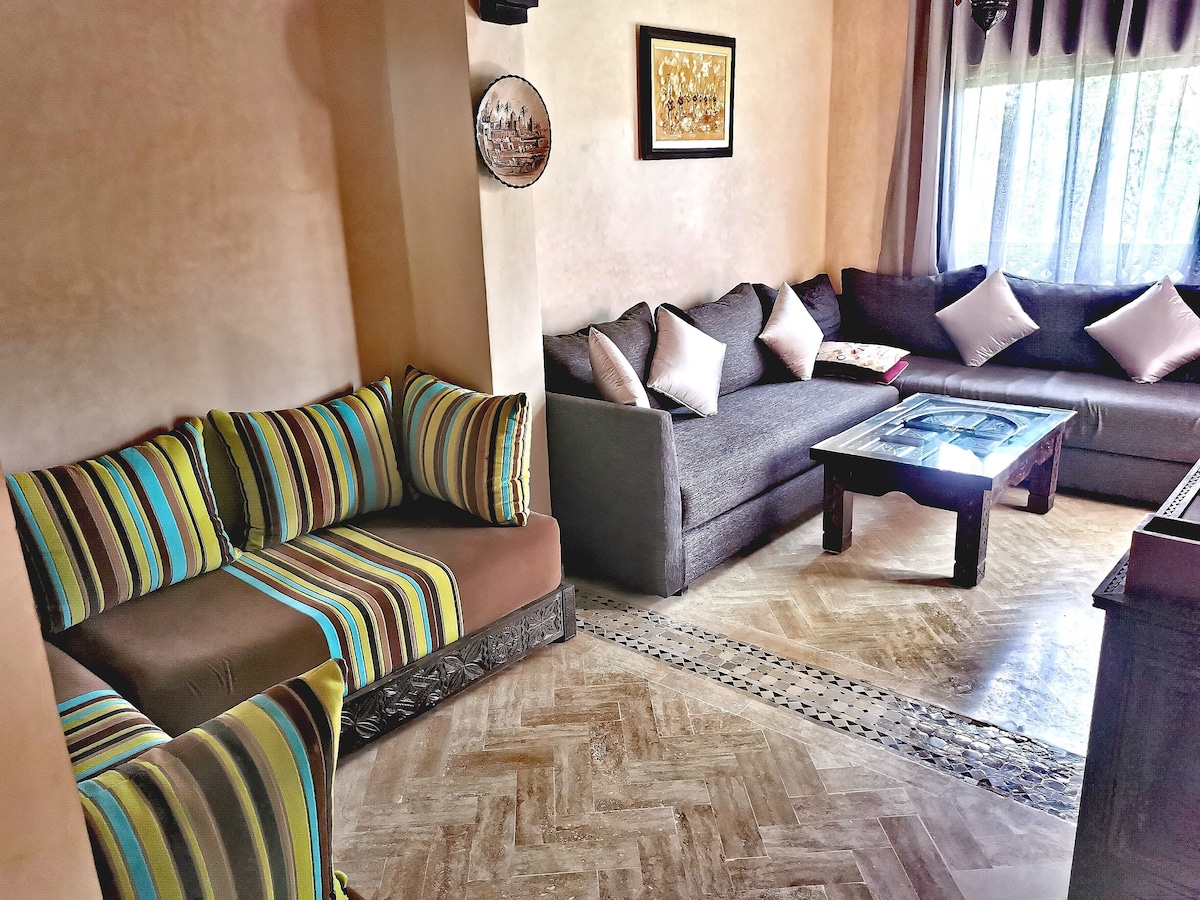 ¡Bienvenido a las Perlas de Marrakech, donde el lujo se une a la serenidad! Sumérjase en la elegancia de nuestro apartamento de dos dormitorios, a solo 7 minutos de la vibrante plaza Jemaa el-Fna. Relájese en un salón oriental, disfrute de una cocina equipada y admire la Koutoubia desde su terraza. Disfrute de la piscina durante todo el año y explore los tesoros cercanos como el Palacio de la Bahía. Con una ubicación ideal, a 10 minutos del centro de congresos de Gueliz y a 6 km del aeropuerto.