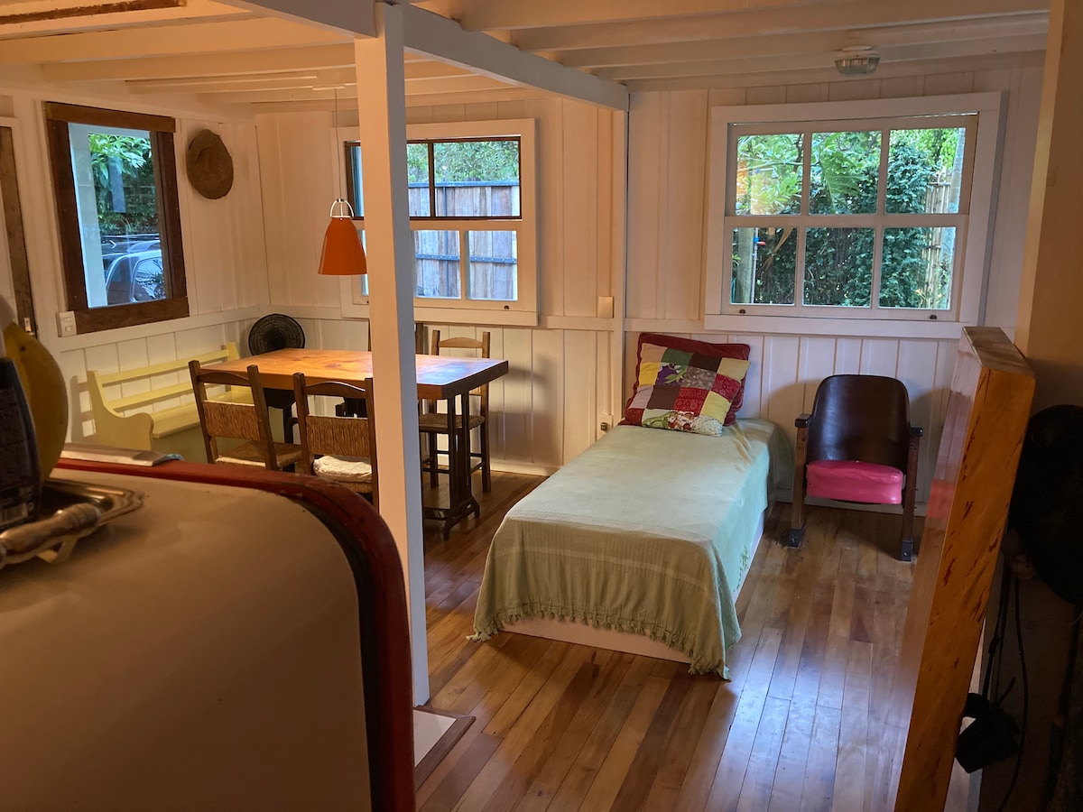 Cosy 1-bedroom, stylish wooden house with many original features only 100 m from Rio da Madre. Ideal for couples with up to 1 child. It is situated in a quiet but central cul-de-sac making it one of the best locations in Guarda do Embaú. Ideal for nature and water lovers that don't want to miss out on comfort.