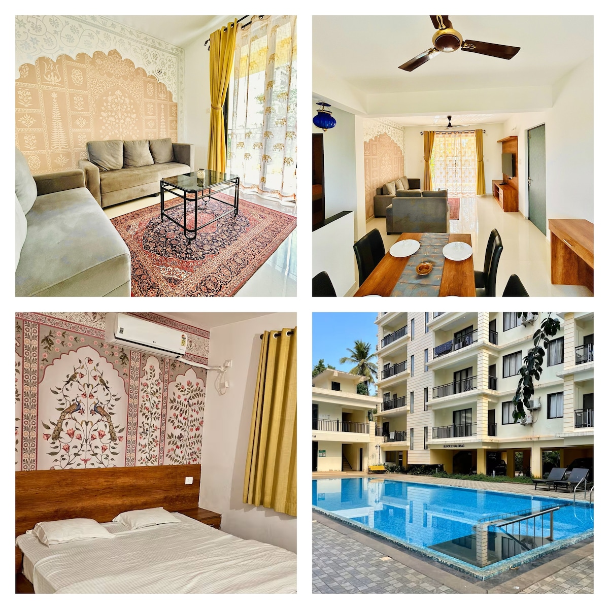 Fully furnished, beach-side apartment in South Goa, with living room, 2 AC bedrooms, 2 washrooms, 3 balconies, TV, workspace, power back-up, washing machine, RO water, microwave, induction plate, fridge, cutlery, crockery, utensils, toaster, kettle, locker etc. Campus has gym, children's play area, walking track & parking. Apartments 1, 2, 3 & 4 are identical. Wi-fi with 25mbps speed and unlimited GB part of package. Guests can buy up to 100 mbps speed at additional cost.