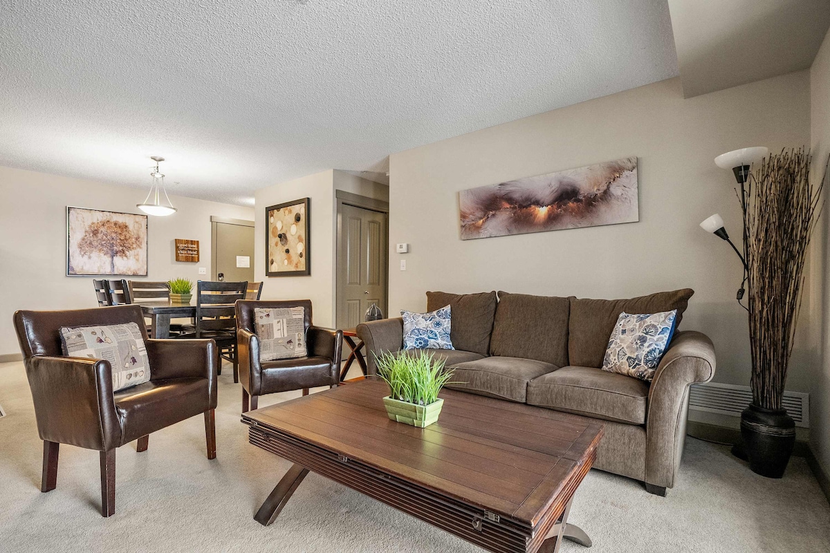 Esquí hasta tu puerta. Centro vacacional de 4 temporadas. Estaciona bajo tierra, ve tu auto cuando te vayas. telesilla a pocos pasos. planta baja, salida, patio privado en un cinturón verde. 2 camas queen + salida. No hay alfombras. Suelo climatizado en el baño. Armario de esquí y cocina equipada. Barbacoa. Camina por tu bata de baño hasta las bañeras de hidromasaje. Tienda general detrás de nuestro condominio. Wifi gratuito. Los huéspedes pueden: esquiar (descenso/campo traviesa), nadar, vehículos todoterreno, esquí en helicóptero, golf, tenis, ciclismo de montaña, caminar/senderismo rodeados por las Montañas Rocosas.