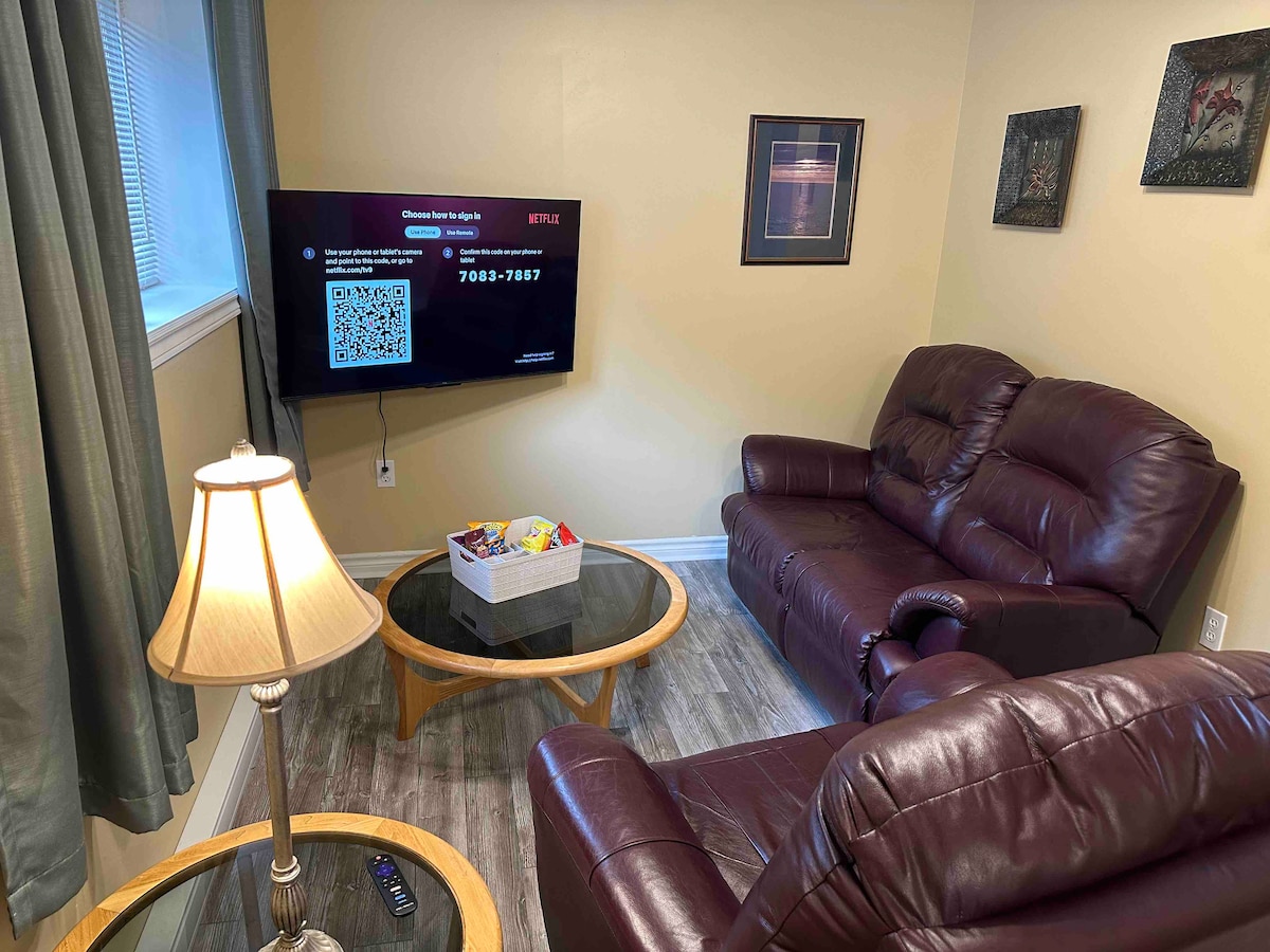 Precioso apartamento en el sótano de un dormitorio. 2 niños pequeños viven arriba y perros, ten en cuenta que al reservar puede ser ruidoso a veces :) 1 cama matrimonial 1 sillón de cuero 1 silla de cuero 1 cuna individual Cargador de E/V para vehículos eléctricos 🚗 6:00 p. m., registro de entrada. A 20 minutos de ambos hospitales y aproximadamente a 20 minutos del aeropuerto. Consulta nuestra política de cancelación estricta antes de reservar. Las reservaciones no son reembolsables ni transferibles. NO se permiten MARISCOS en la unidad debido a alergias. Registro provincial n.º 5468