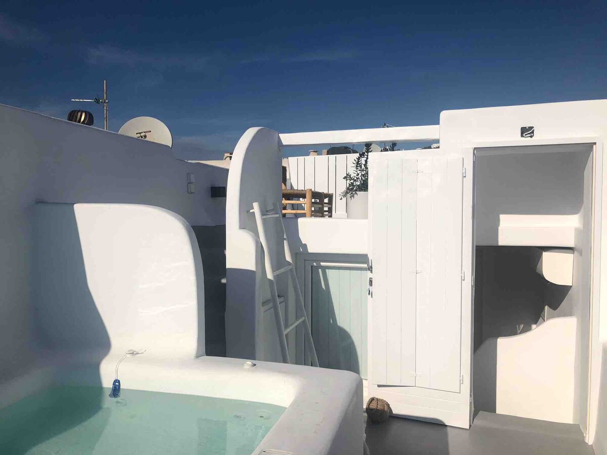 Toma impresionantes fotos del atardecer en el paseo marítimo de Little Venice desde esta propiedad elevada, uno de los lugares más fotografiados de la isla. El interior redondeado ofrece una experiencia única, con las paredes gruesas que garantizan paz y tranquilidad.