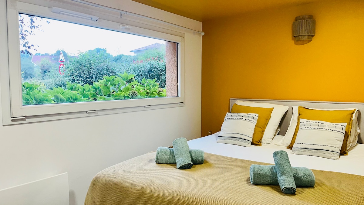 En una casa saboyana de 1889, hemos creado un apartamento de 85 m² con una sala de estar de 30 m² y un balcón terraza de 20 m² con vistas a un jardín orientado al sur para darle la bienvenida en esta hermosa región. La sala de estar y las habitaciones tienen aire acondicionado. Posibilidad de pedir desayunos. Fácil acceso por la autopista que se encuentra a 2 km.