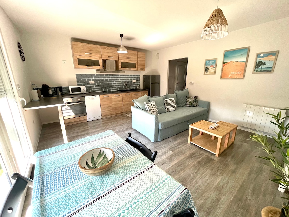 Alojamiento a 2 pasos de las tiendas , a 2,5 km del lago y a 25 minutos del océano. Jardín con terraza cubierta en un entorno tranquilo. Sala de estar con sofá cama ,cocina abierta equipada ( horno, microondas, lavavajillas, cafetera) y cuarto de baño con ducha/inodoro Una habitación arriba con cama para 2 personas. Alojamiento no accesible en silla de ruedas. Se proporciona ropa de cama No se admiten animales/vivienda para no fumadores Aparcamiento para 1 coche Alojamiento limpio a su llegada gracias por dejarlo así.